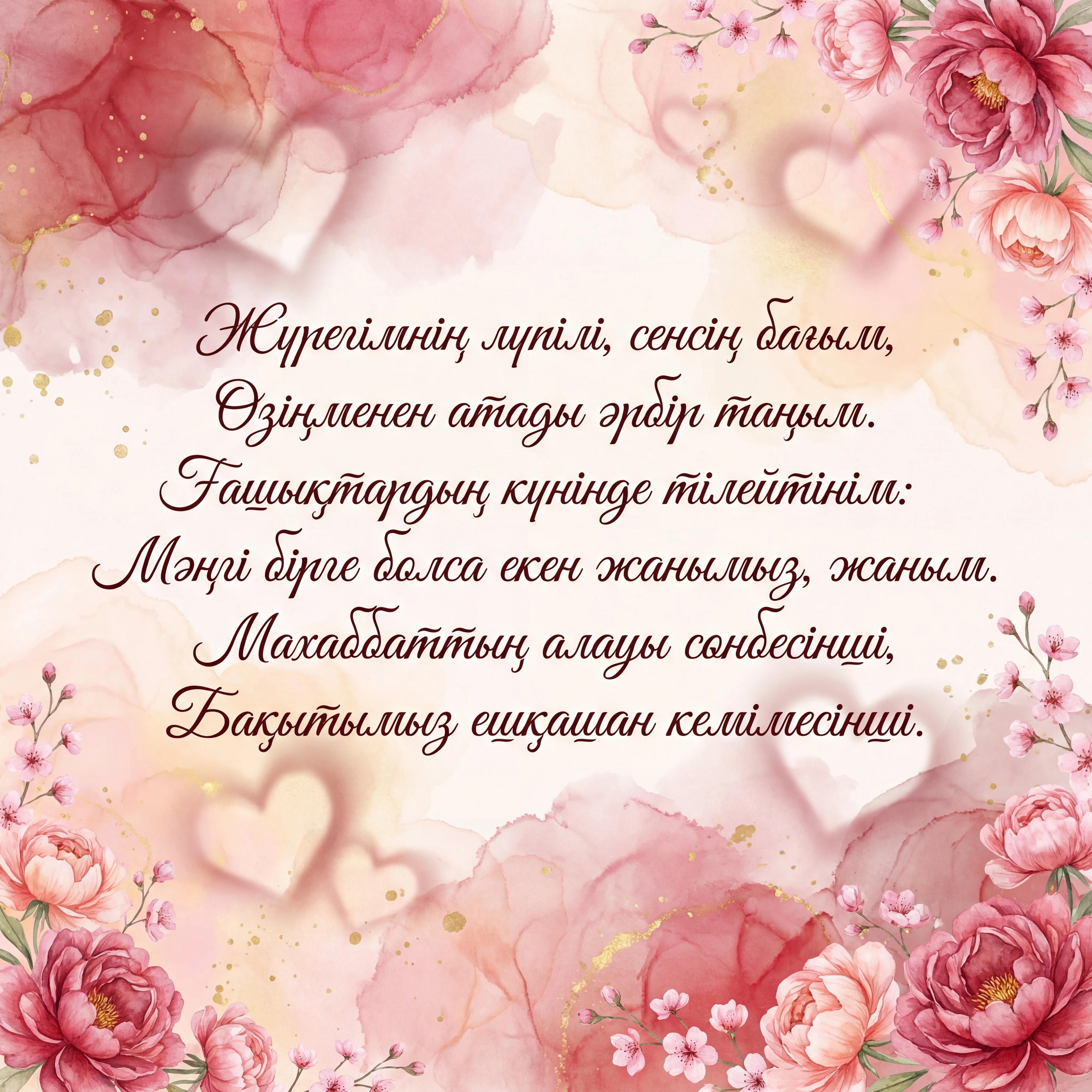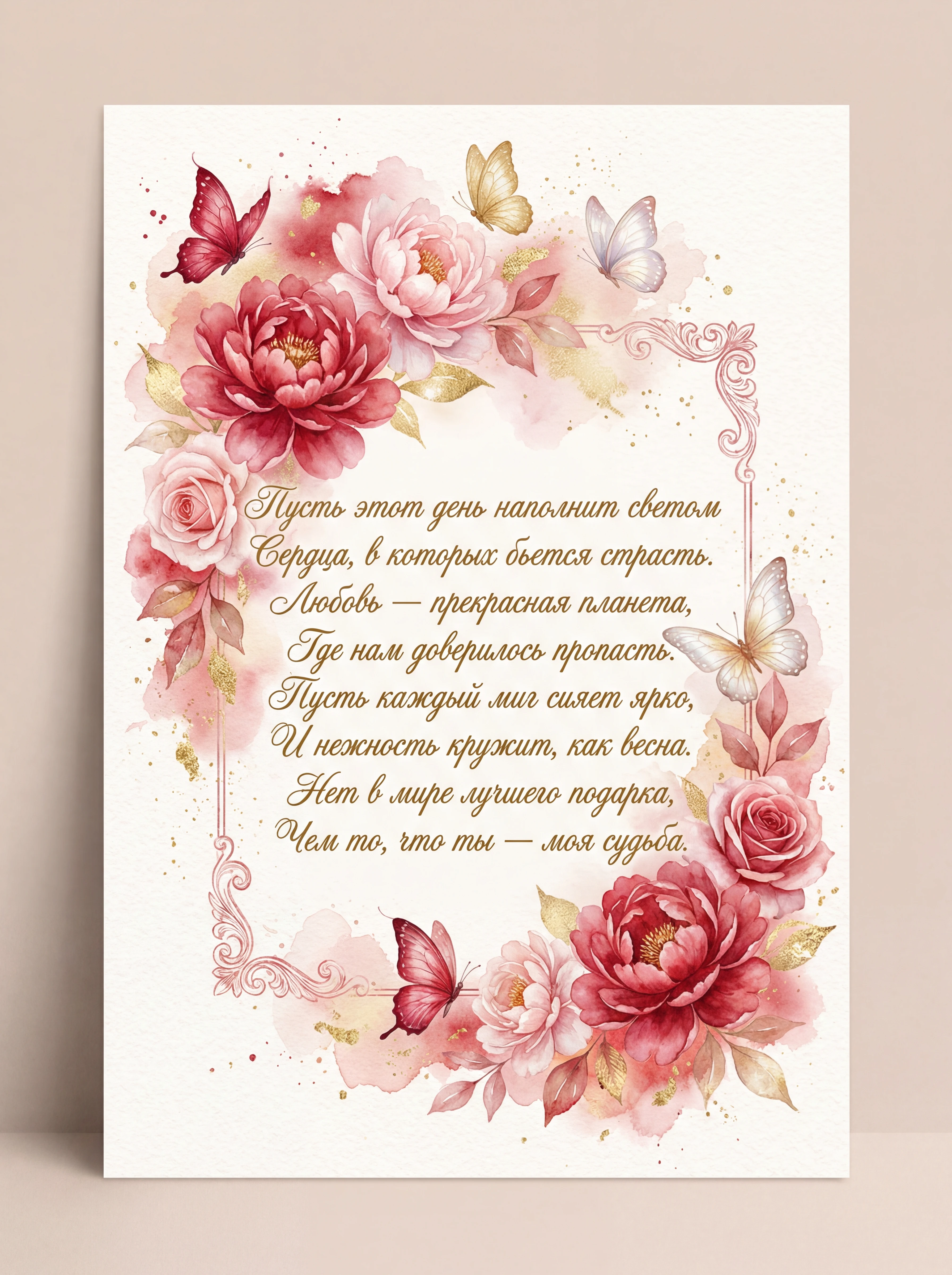 Пусть этот день наполнится теплом, Любовь пусть согревает нежным светом. Мы будем вечно счастливы вдвоем, И в сердце пусть всегда сияет лето. Ты — радость, вдохновение мое, Тебе дарю я нежность и признанье. Пусть в унисон сердца поют вдвоем, Исполнятся заветные желанья.