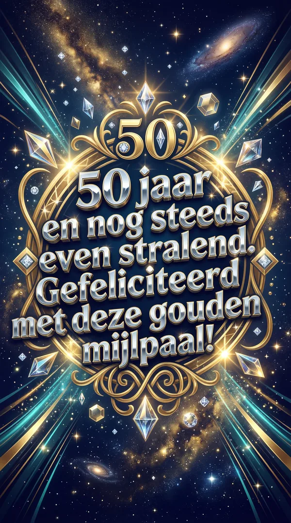 Vijftig jaar, een gouden mijlpaal bereikt, Een leven vol wijsheid dat nergens voor wijkt. Nog volop in kracht en met passie in 't hart, Vandaag maken we voor de toekomst een nieuwe start. Gefeliciteerd met deze prachtige kroon, Je bent op je best, krachtig en schoon.
