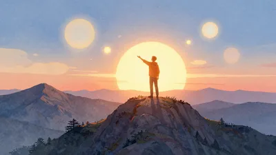 – لوحة مائية بسيطة لامرأة تشاهد شروق الشمس الدافئ والملهم في الجبال.