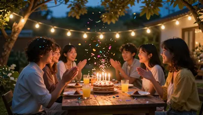 – تجمع احتفالي على شرفة مشمسة مع إضاءة ذهبية دافئة وأجواء ودية رائعة.