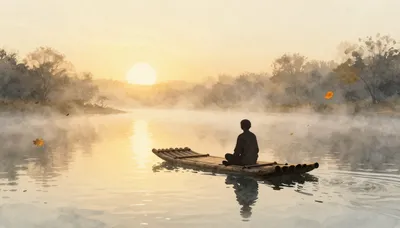 – غروب الشمس فوق النهر، مما يخلق ألواناً وانعكاسات جميلة على سطح الماء.