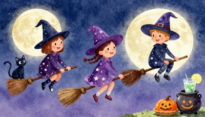 – Ulduzlu gecə səmasında süpürgə ilə uçan şən cadugərlərin şəkilləri.