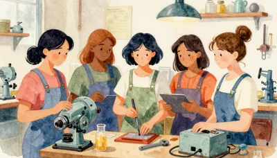– Elmdə qadınlar, laboratoriya xalatları və tədqiqat mühitləri şəkilləri.