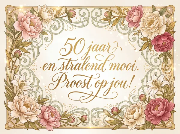 Vijftig jaar, een gouden mijlpaal bereikt, Een leven vol wijsheid dat nergens voor wijkt. Nog volop in kracht en met passie in 't hart, Vandaag maken we voor de toekomst een nieuwe start. Gefeliciteerd met deze prachtige kroon, Je bent op je best, krachtig en schoon.