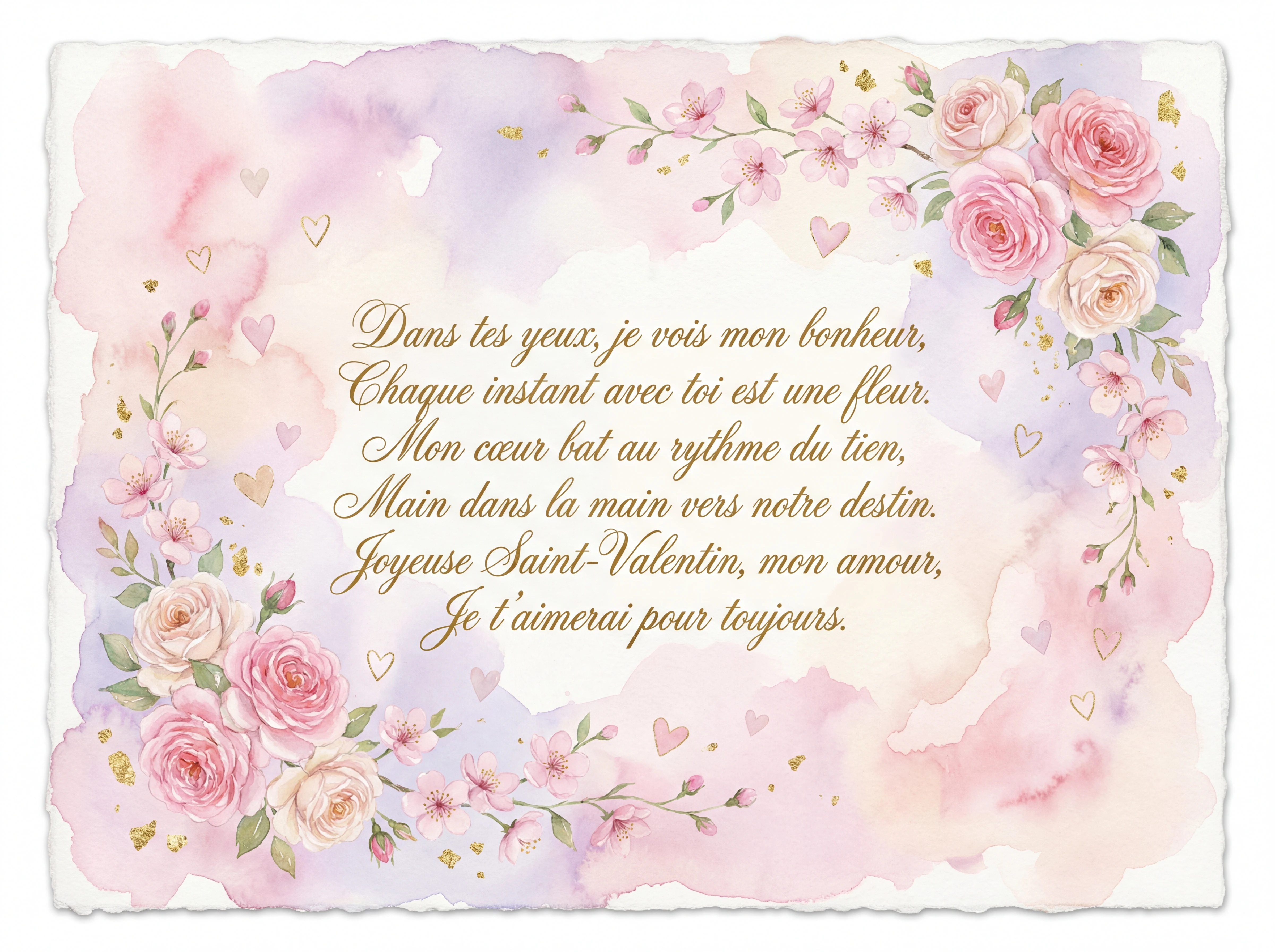 Dans tes yeux, je vois mon bonheur, Chaque instant avec toi est une fleur. Mon cœur bat au rythme du tien, Main dans la main vers notre destin. Joyeuse Saint-Valentin, mon amour, Je t'aimerai pour toujours.