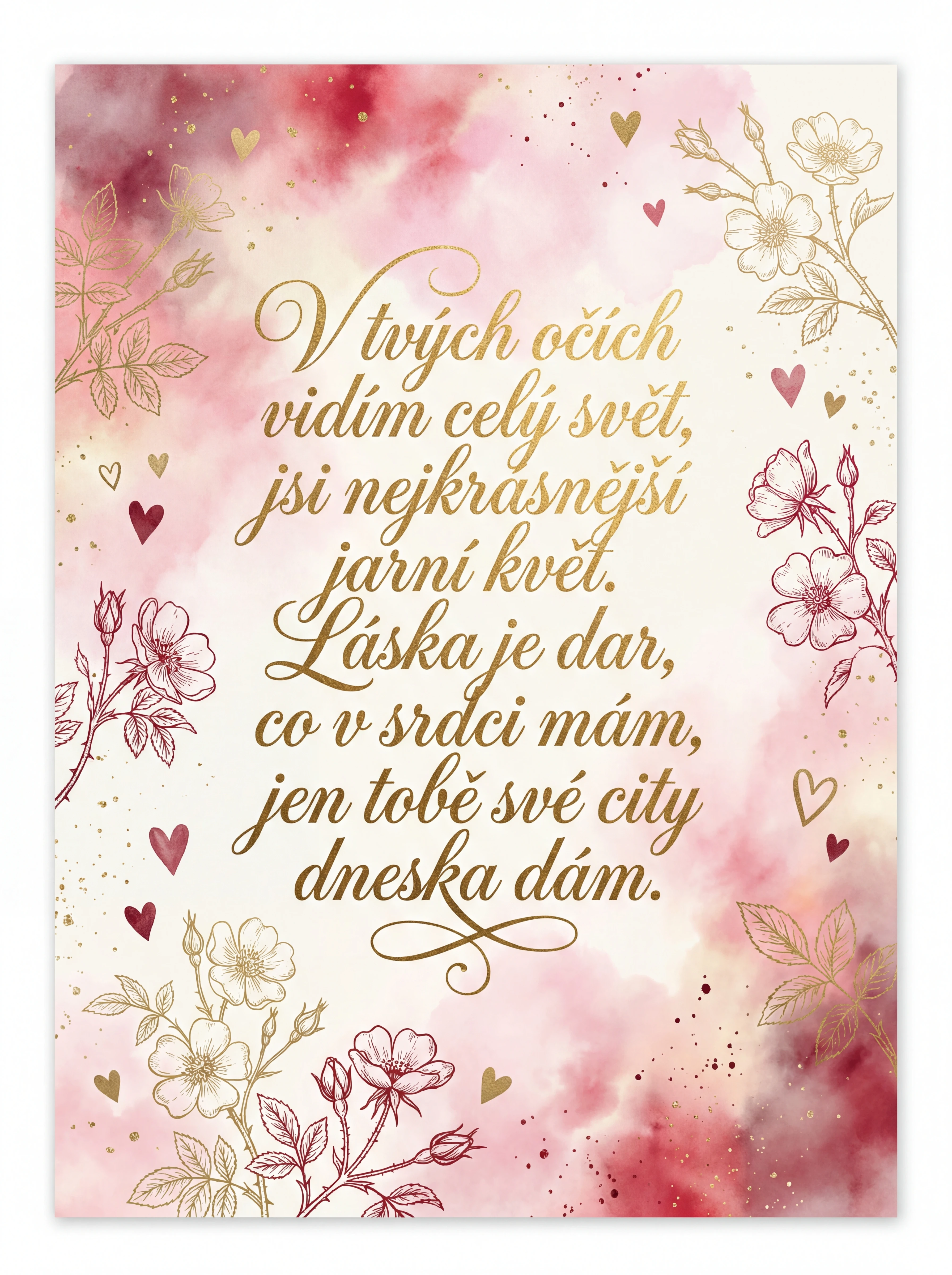 V tvých očích vidím celý svět, jsi nejkrásnější jarní květ. Láska je dar, co v srdci mám, jen tobě své city dneska dám.