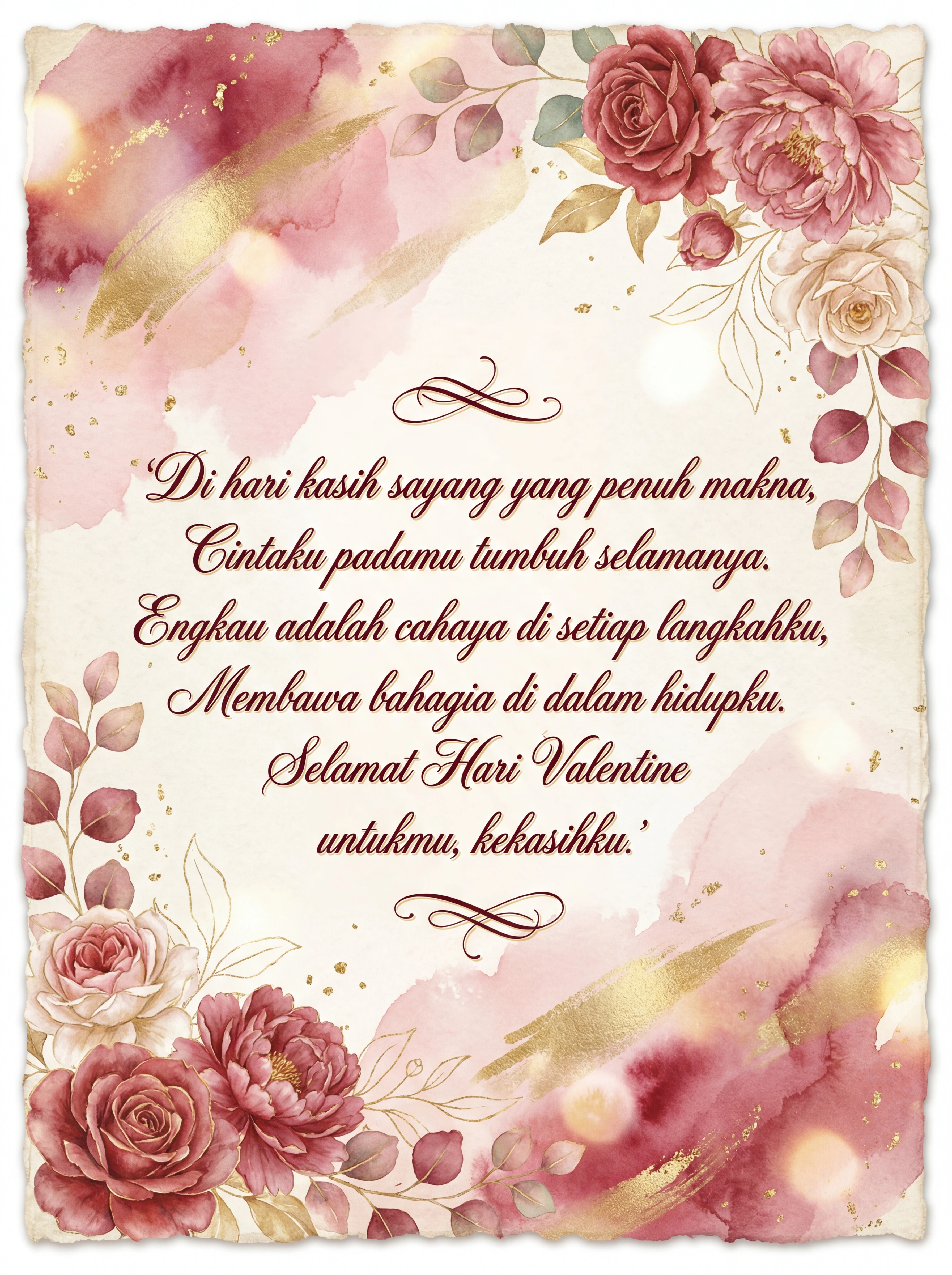 Di hari kasih sayang yang penuh makna, Cintaku padamu tumbuh selamanya. Engkau adalah cahaya di setiap langkahku, Membawa bahagia di dalam hidupku. Selamat Hari Valentine untukmu, kekasihku.