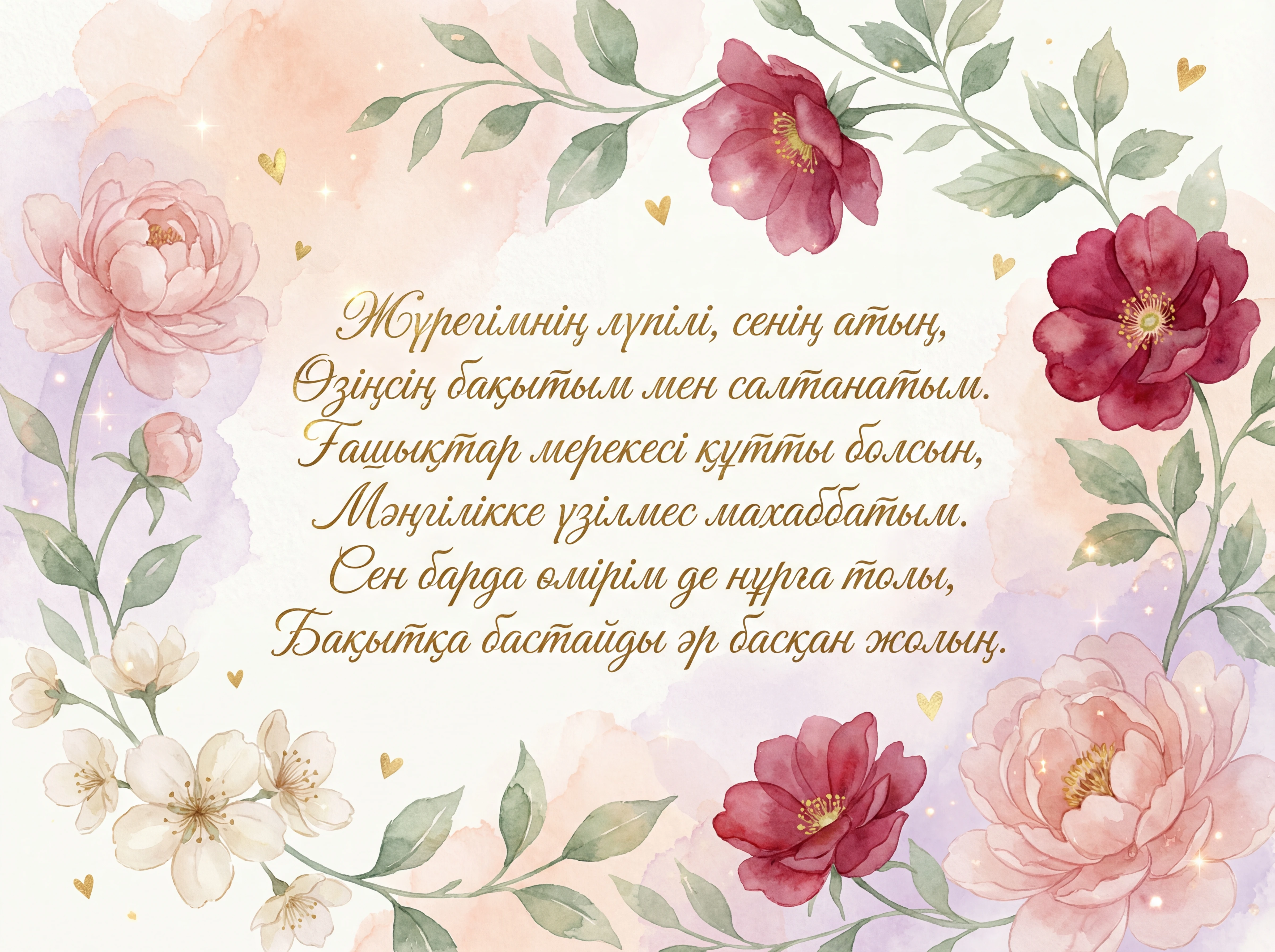 Жүрегімнің лүпілі, сенің атың, Өзіңсің бақытым мен салтанатым. Ғашықтар мерекесі құтты болсын, Мәңгілікке үзілмес махаббатым. Сен барда өмірім де нұрға толы, Бақытқа бастайды әр басқан жолың.