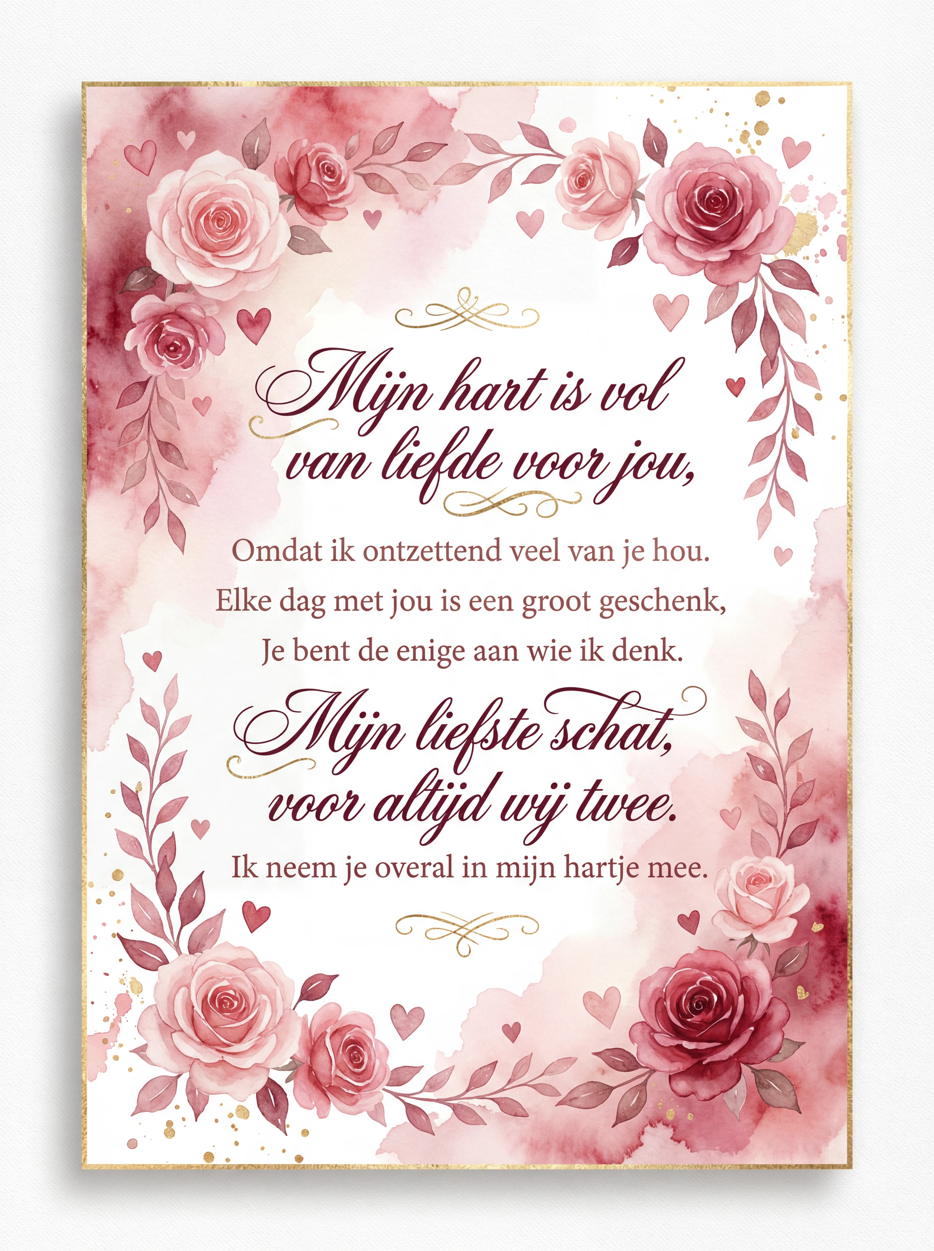 Mijn hart is vol van liefde voor jou, Omdat ik ontzettend veel van je hou. Elke dag met jou is een groot geschenk, Je bent de enige aan wie ik denk. Mijn liefste schat, voor altijd wij twee, Ik neem je overal in mijn hartje mee.