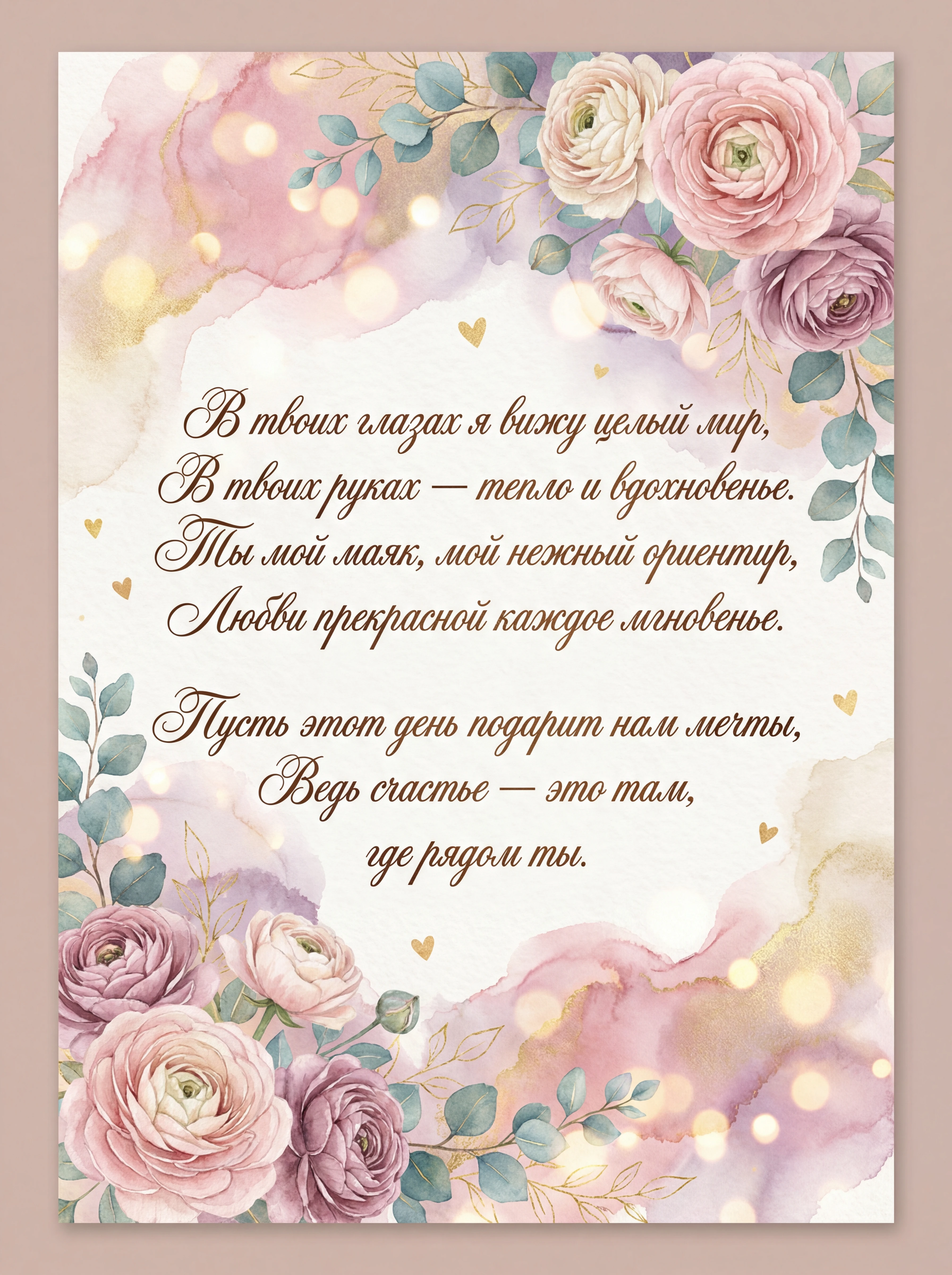В твоих глазах я вижу целый мир, В твоих руках — тепло и вдохновенье. Ты мой маяк, мой нежный ориентир, Любви прекрасной каждое мгновенье. Пусть этот день подарит нам мечты, Ведь счастье — это там, где рядом ты.