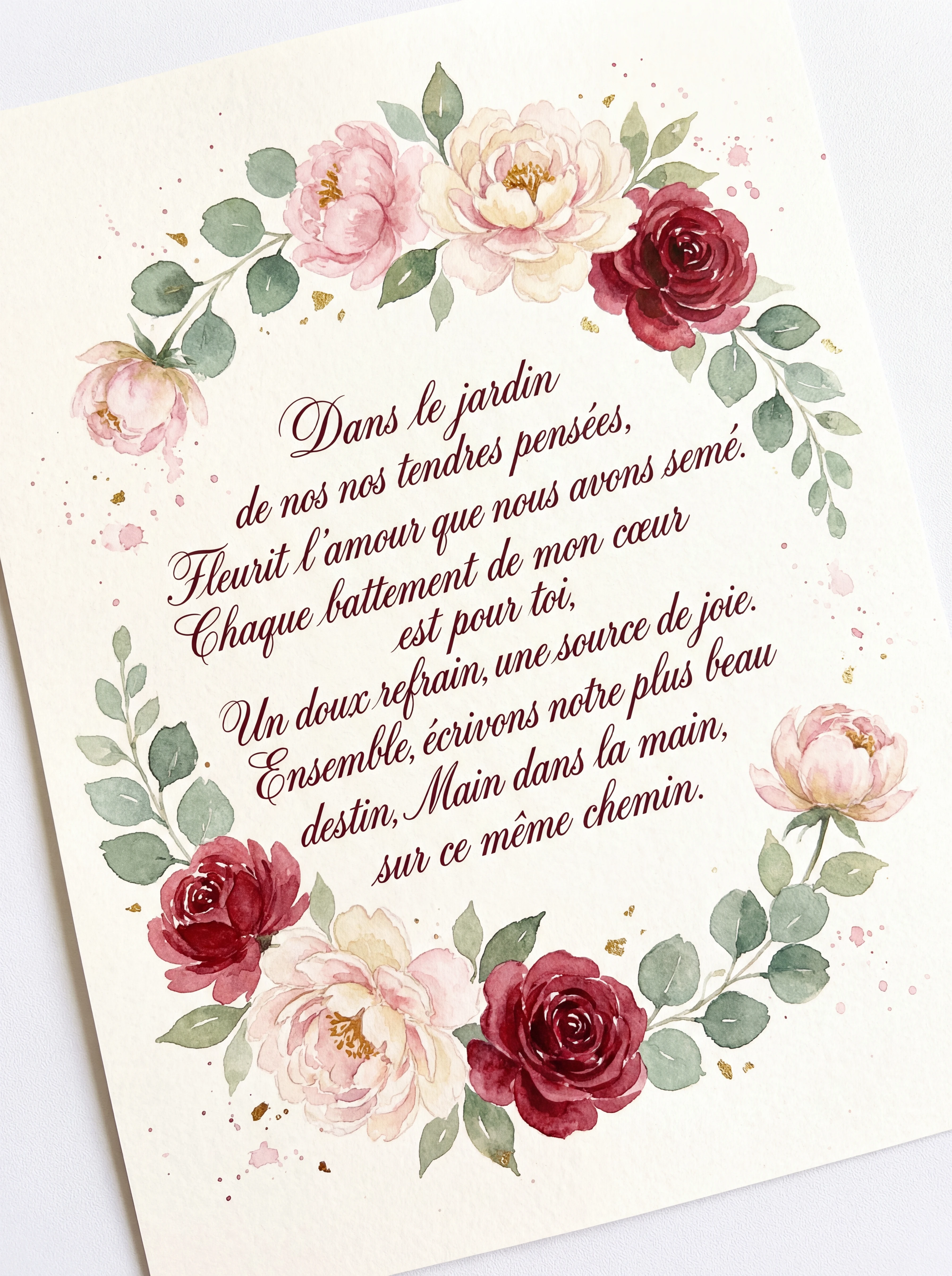 Dans le jardin de nos tendres pensées, Fleurit l'amour que nous avons semé. Chaque battement de mon cœur est pour toi, Un doux refrain, une source de joie. Ensemble, écrivons notre plus beau destin, Main dans la main, sur ce même chemin.