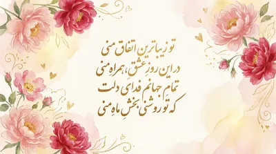 ای عشق من، ای همدم تنهاییام با تو شکفته گل در باغ رویاییام روز ولنتاین مبارک باد بر تو تویی تمام هستی و داراییام