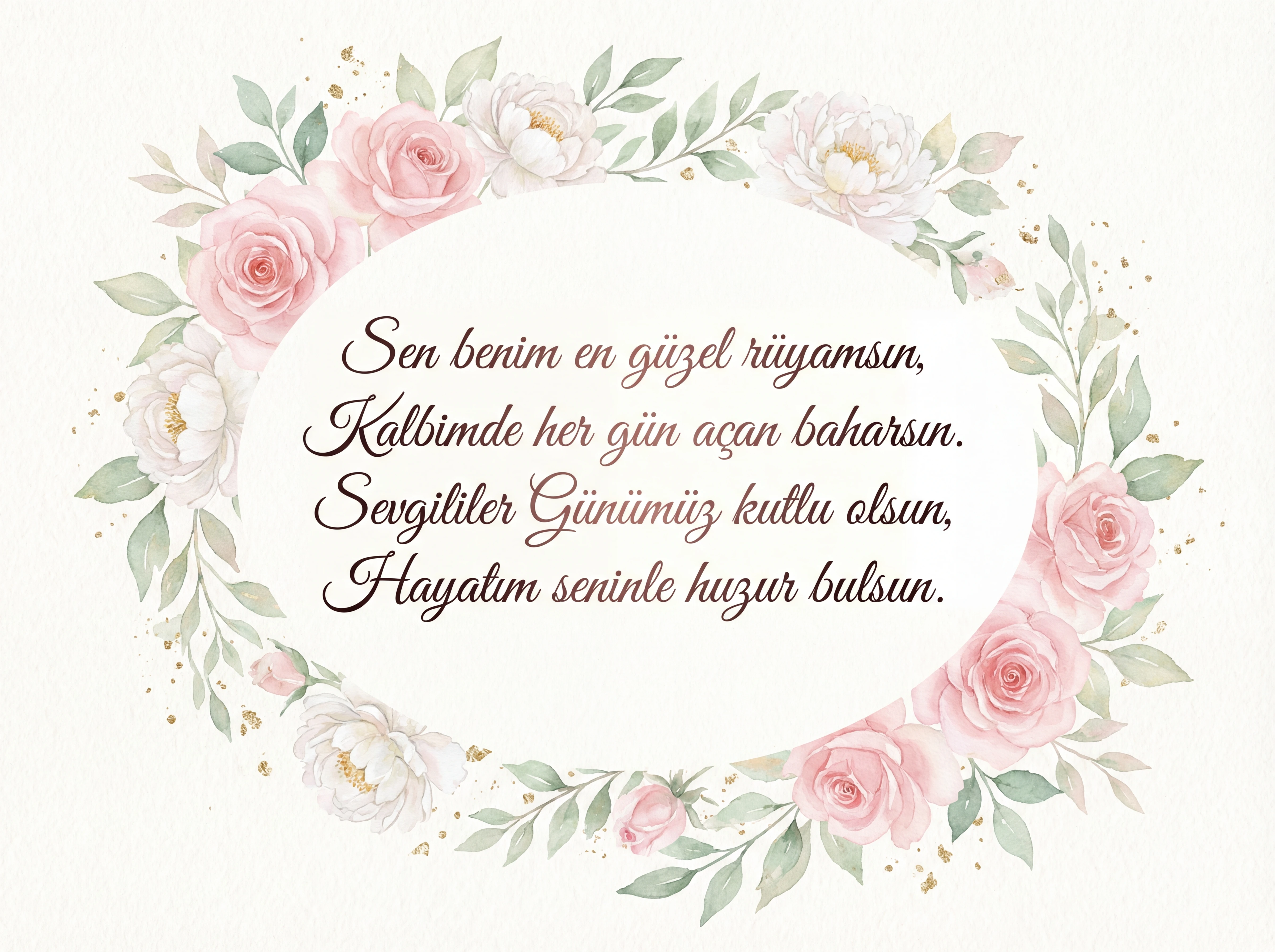 Sen benim en güzel rüyamsın, Kalbimde her gün açan baharsın. Sevgililer Günümüz kutlu olsun, Hayatım seninle huzur bulsun.
