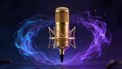 – Detailní záběr na zlatý mikrofon obklopený zářící magickou energií.
