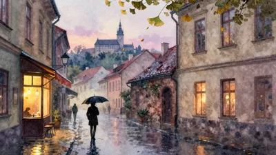 – Umělecké snímky osamělého muže kráčejícího v dešti, vyvolávající hloubavou náladu.