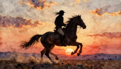 – Osoba jedoucí na koni, často zobrazovaná v historických, dobrodružných nebo osamělých prostředích.
