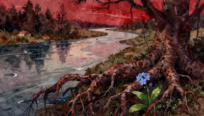 – Umělecká zobrazení řek zahalených v mlze.