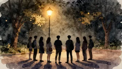 – Scény v parku během noci, často s umělým osvětlením.