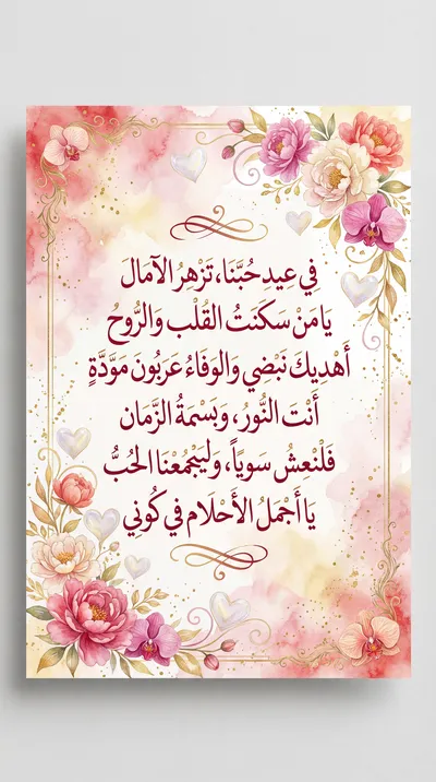 في عيد حبنا تزهو الأماني يا من سكنت القلب والوجدانِ أهديك نبضي والقصائد كلها يا أجمل الأقدار في أزماني دمت لي حباً ونوراً ساطعاً يملأ بالدفء كل كياني