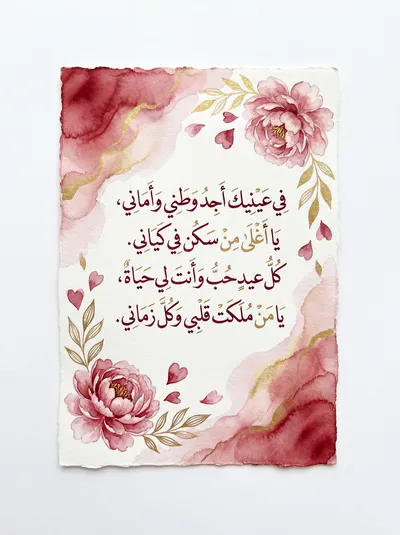 في عيد حبنا، يا من ملكتِ فؤادي، أنتِ الربيعُ وكلُّ أعيادي. عيناكِ موطني، وحبُّكِ غايتي، يا أجملَ الأقدارِ في ميلادي.
