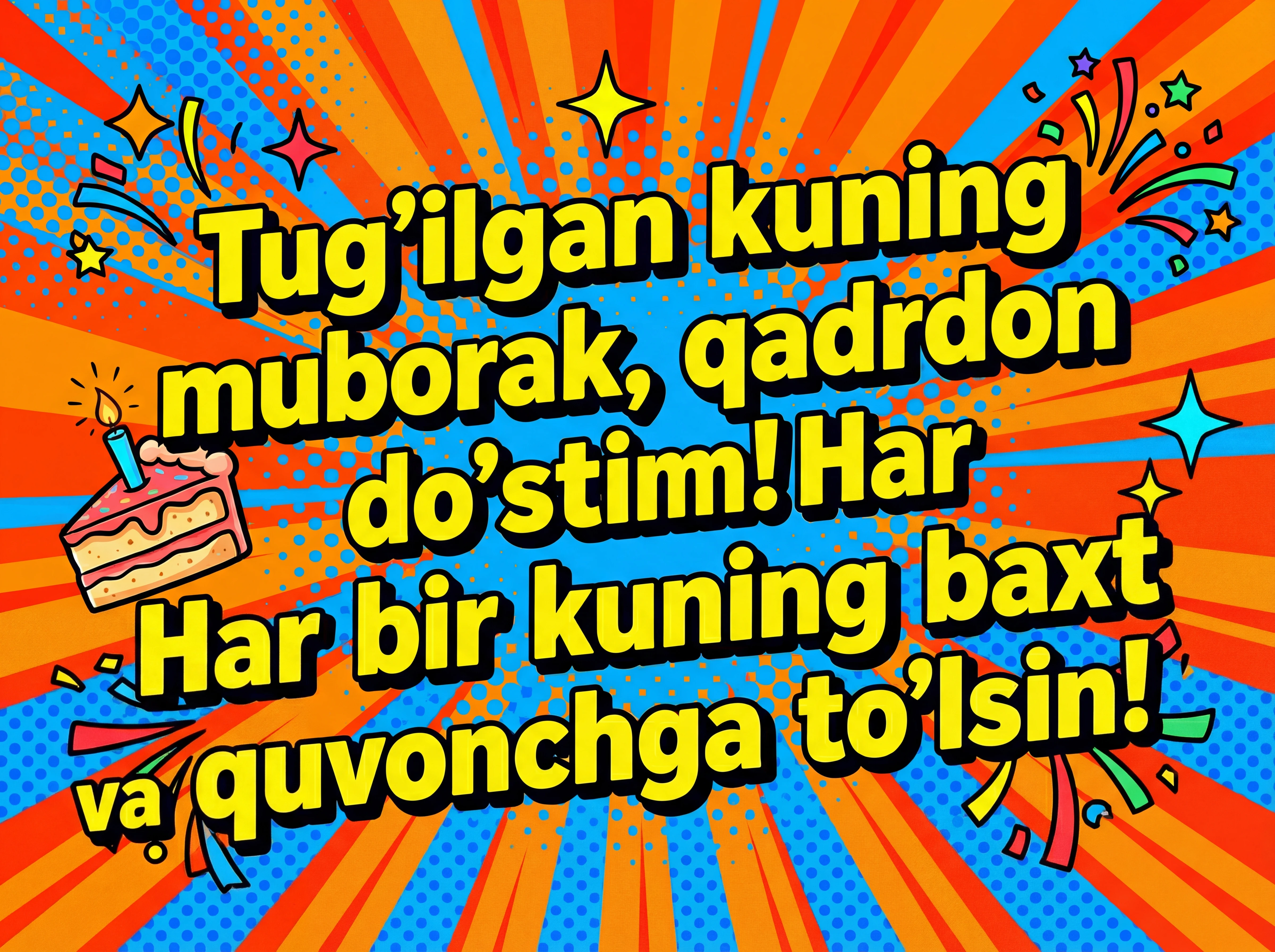 Tug'ilgan kuning muborak, qadrdon do'stim! Har bir kuning baxt va quvonchga to'lsin!