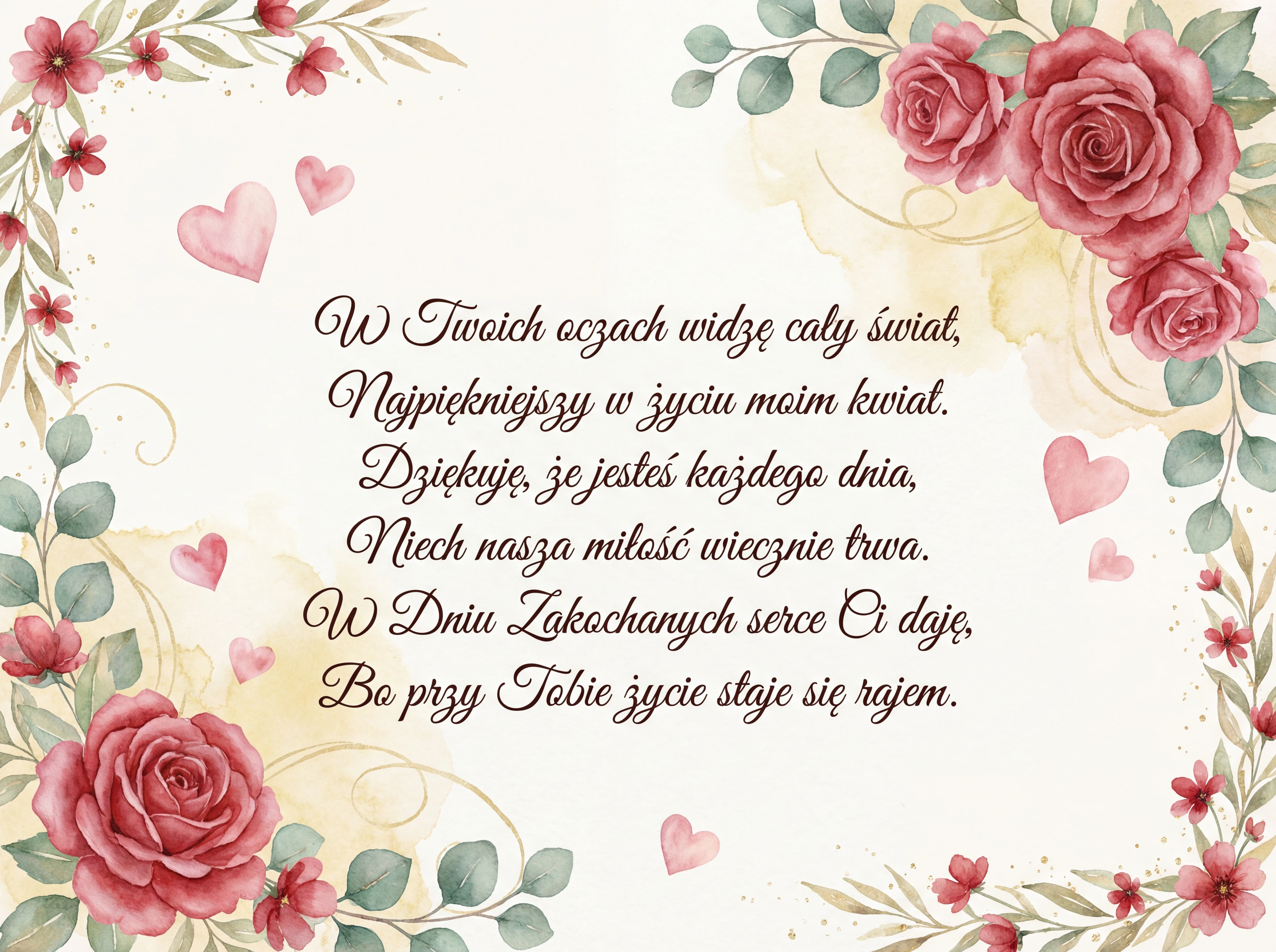 W Twoich oczach widzę cały świat, Najpiękniejszy w życiu moim kwiat. Dziękuję, że jesteś każdego dnia, Niech nasza miłość wiecznie trwa. W Dniu Zakochanych serce Ci daję, Bo przy Tobie życie staje się rajem.