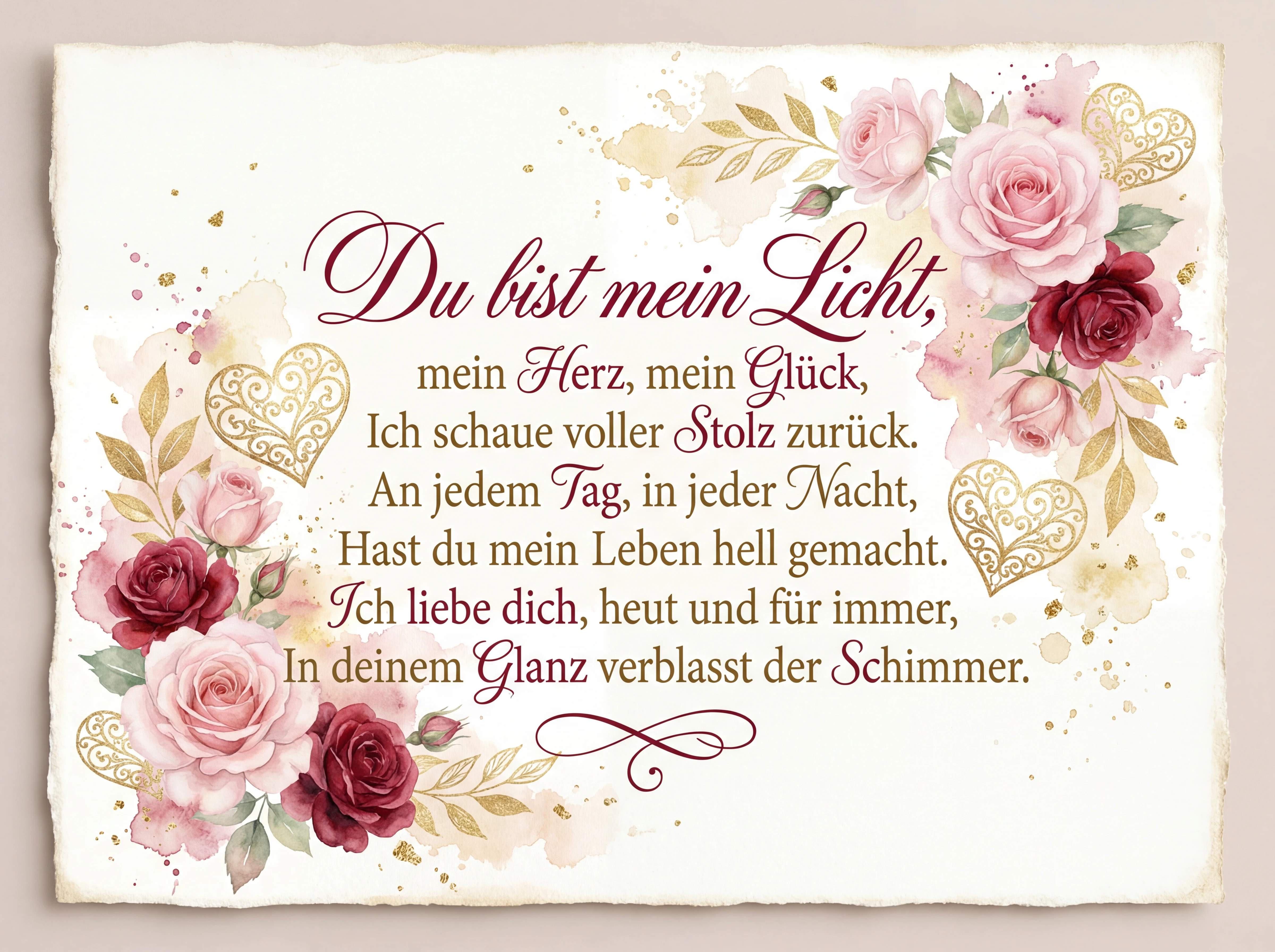 Du bist mein Licht, mein Herz, mein Glück, Ich schaue voller Stolz zurück. An jedem Tag, in jeder Nacht, Hast du mein Leben hell gemacht. Ich liebe dich, heut und für immer, In deinem Glanz verblasst der Schimmer.