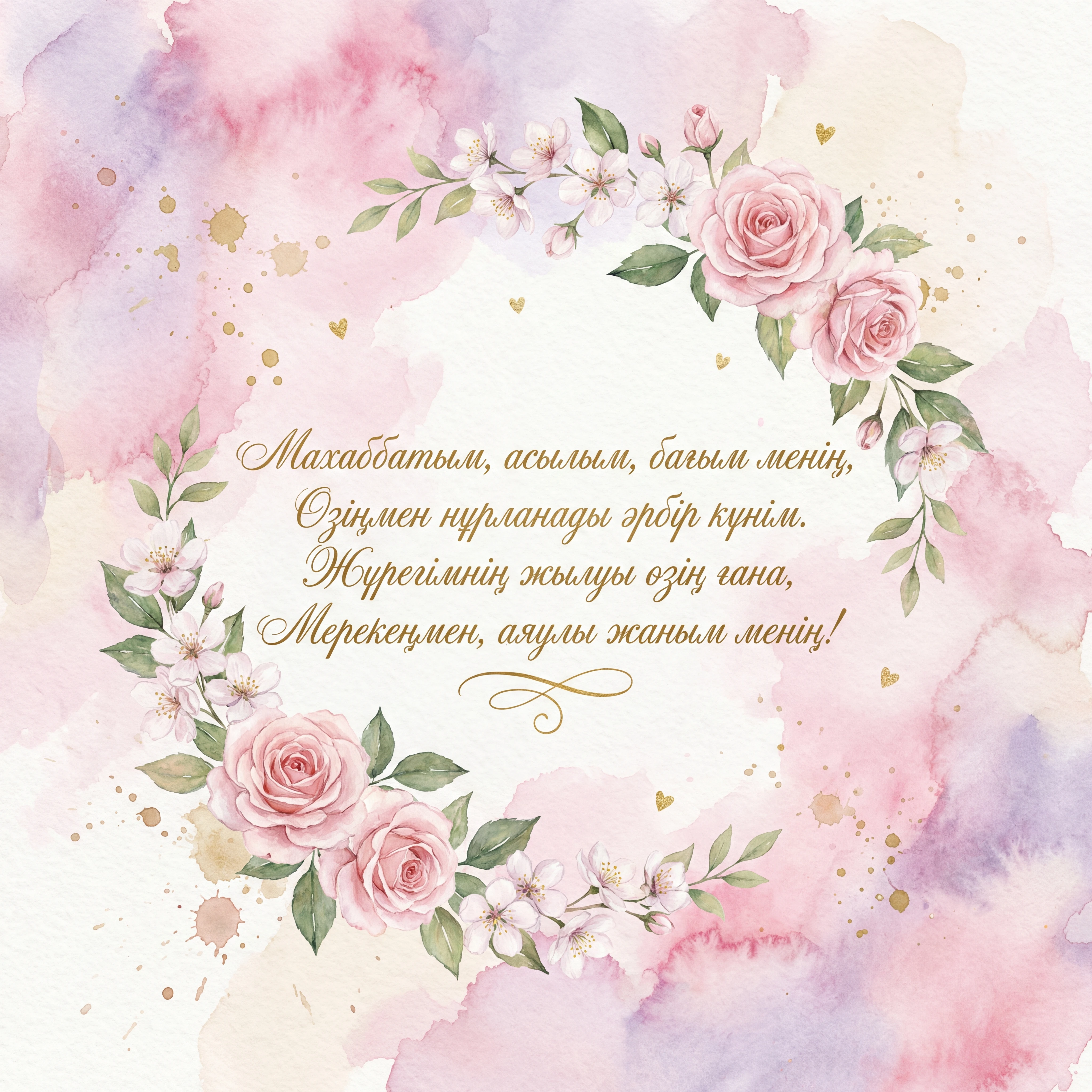 Сенің нұрлы жүзіңнен бақыт табам, Махаббатым өзіңе мәңгі арналған. Ғашықтардың күнінде тілек айтам, Жүрегіміз бір соқсын әрқашан да.