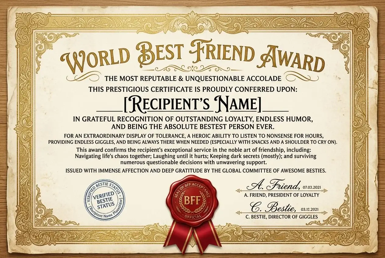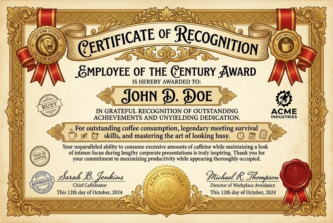 Erstellen Sie urkomische personalisierte Zertifikate, Diplome und Auszeichnungen mit KI. Ob Geburtstag, Büroparty, Jubiläum oder einfach nur zum Spaß — generieren Sie in Sekundenschnelle professionell aussehende lustige Dokumente mit Zierrändern, offiziellen Siegeln und schöner Typografie.