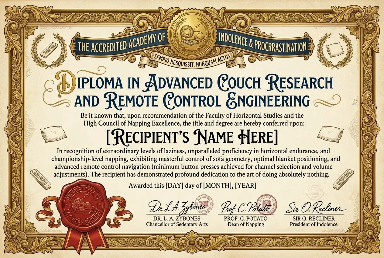 Für die Geburtstagsparty meines Freundes genutzt – das 'Professioneller Couch-Experte'-Diplom war urkomisch! Tolle Qualität, schnelle Generierung!