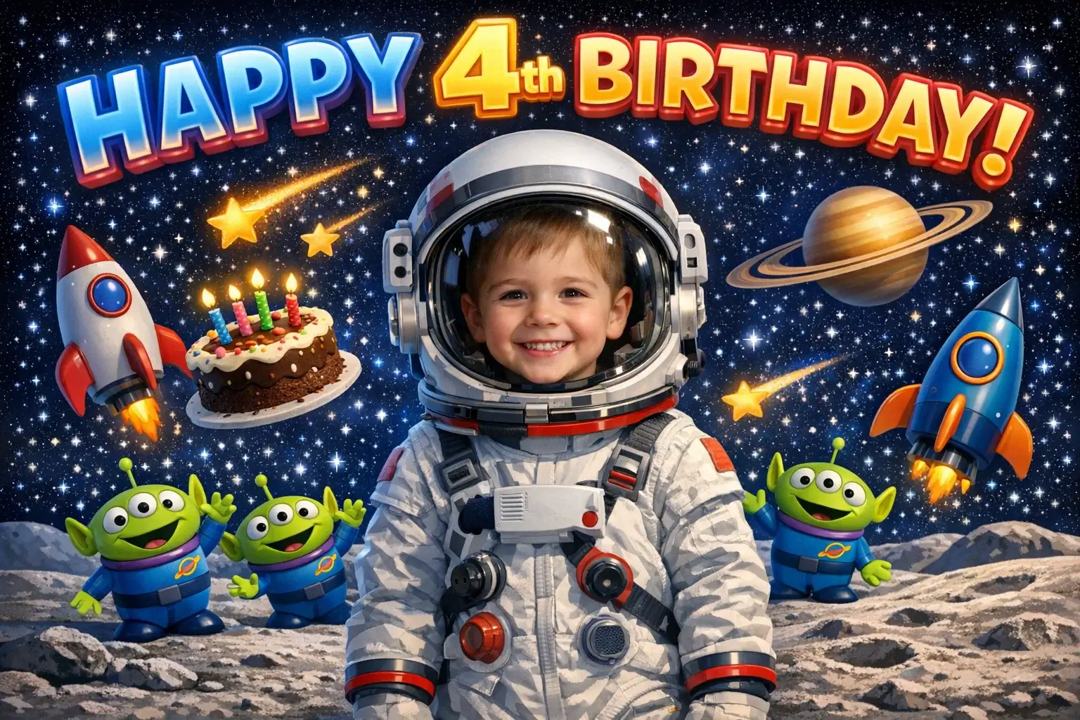 Erstellen Sie mit KI ein magisches Geburtstagsplakat für Ihr Kind. Laden Sie ein Foto hoch und das Kind erscheint in einem Cartoon-Wunderland – umgeben von süßen Charakteren im Pixar-Stil, Luftballons, Kuchen und einer großen bunten Überschrift mit Name und Alter. Das Kind bleibt fotorealistisch, während die Welt um es herum zu einem magischen Cartoon wird. Einhörner, Dinosaurier, Piraten, Weltraum – jedes Thema, von dem Ihr Kind träumt!