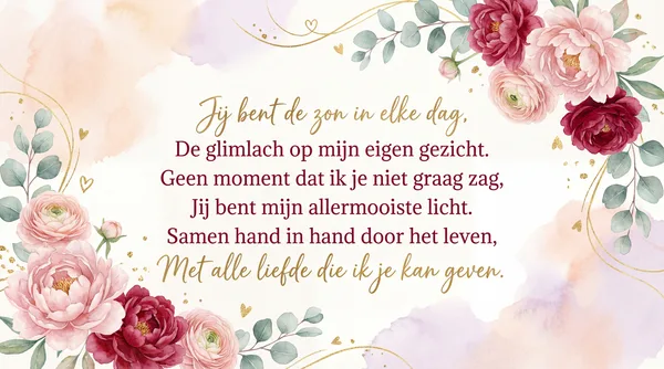 Jij bent de liefde, mijn rust en mijn kracht, De mooiste droom die het leven mij bracht. Vandaag vieren wij wat ons samen verbindt, Omdat ik in jou mijn hele wereld vindt.