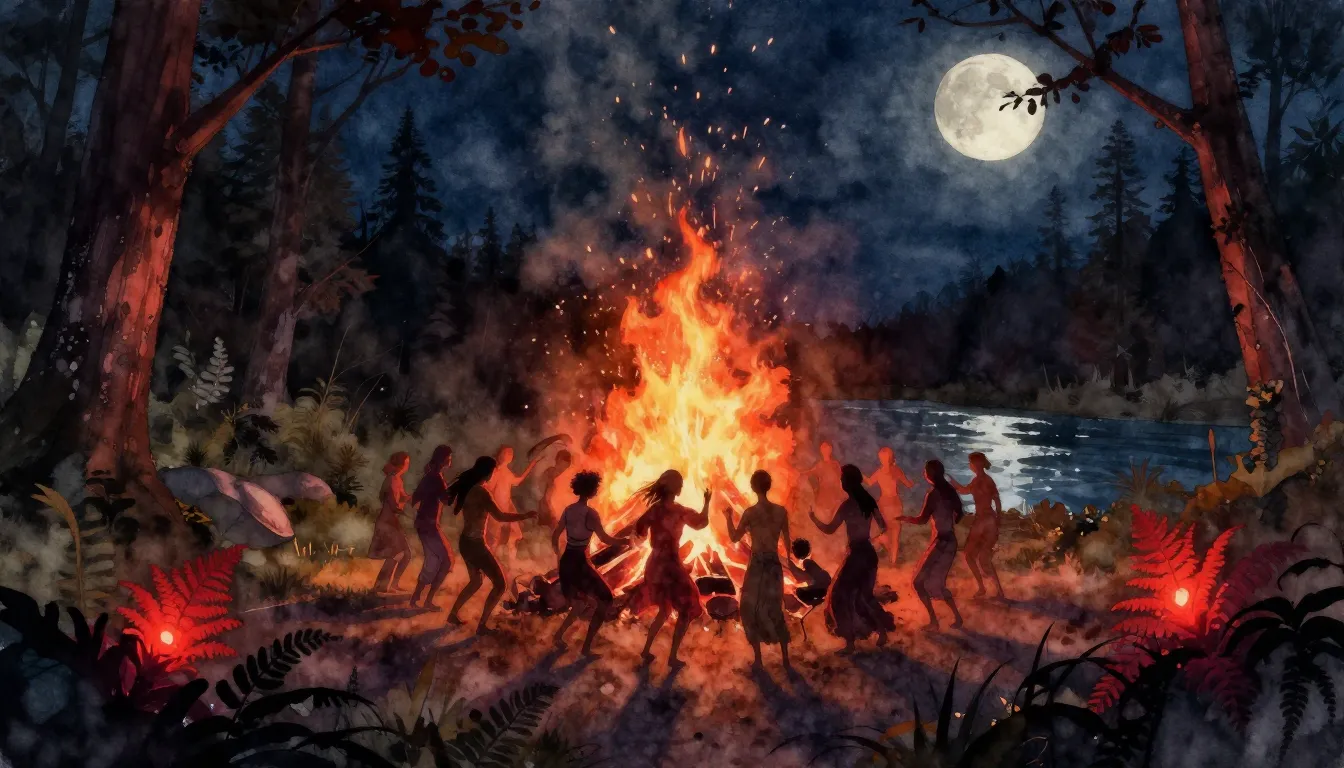 – people gathered around a large outdoor fire, often for celebration or ritual