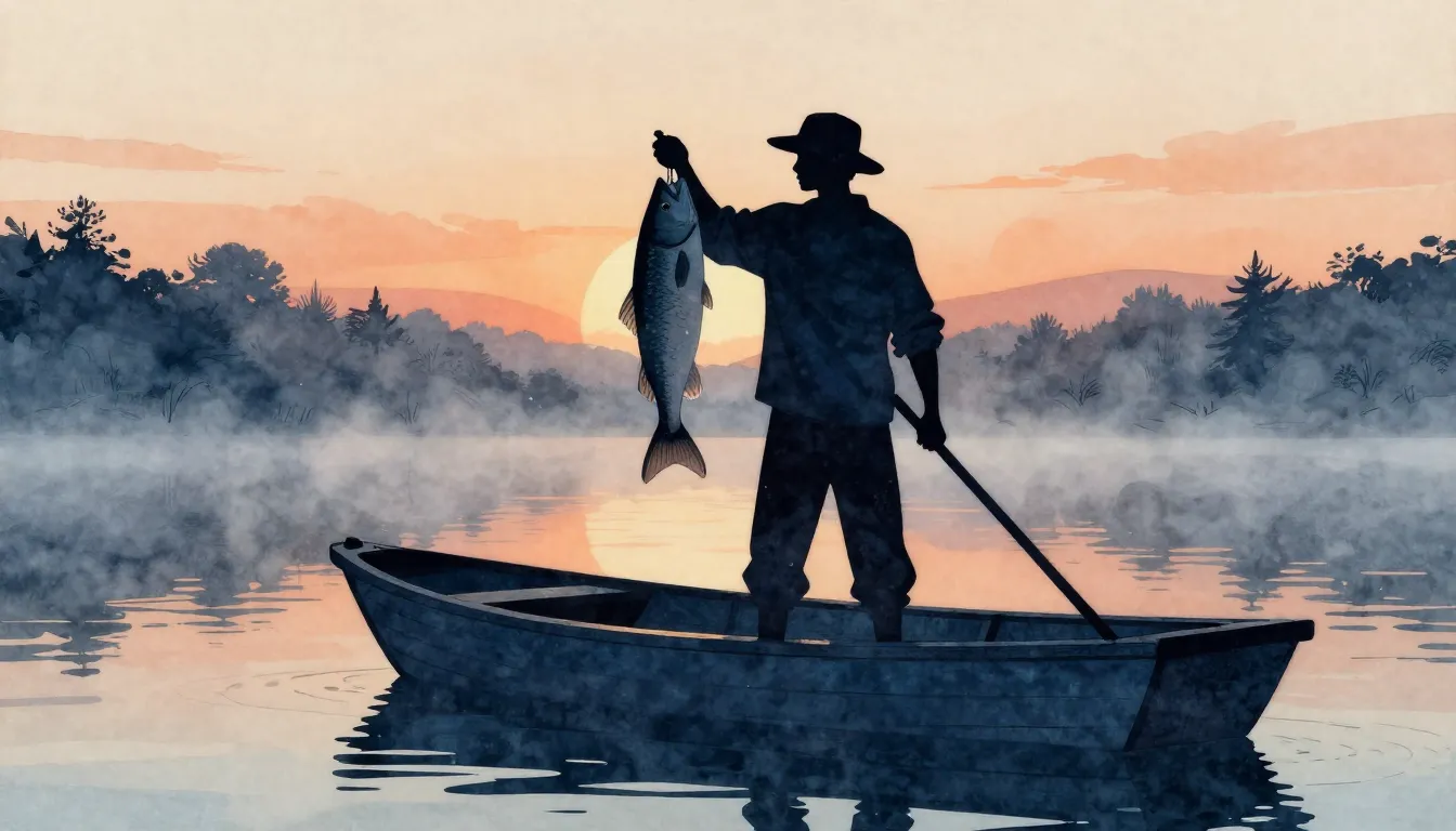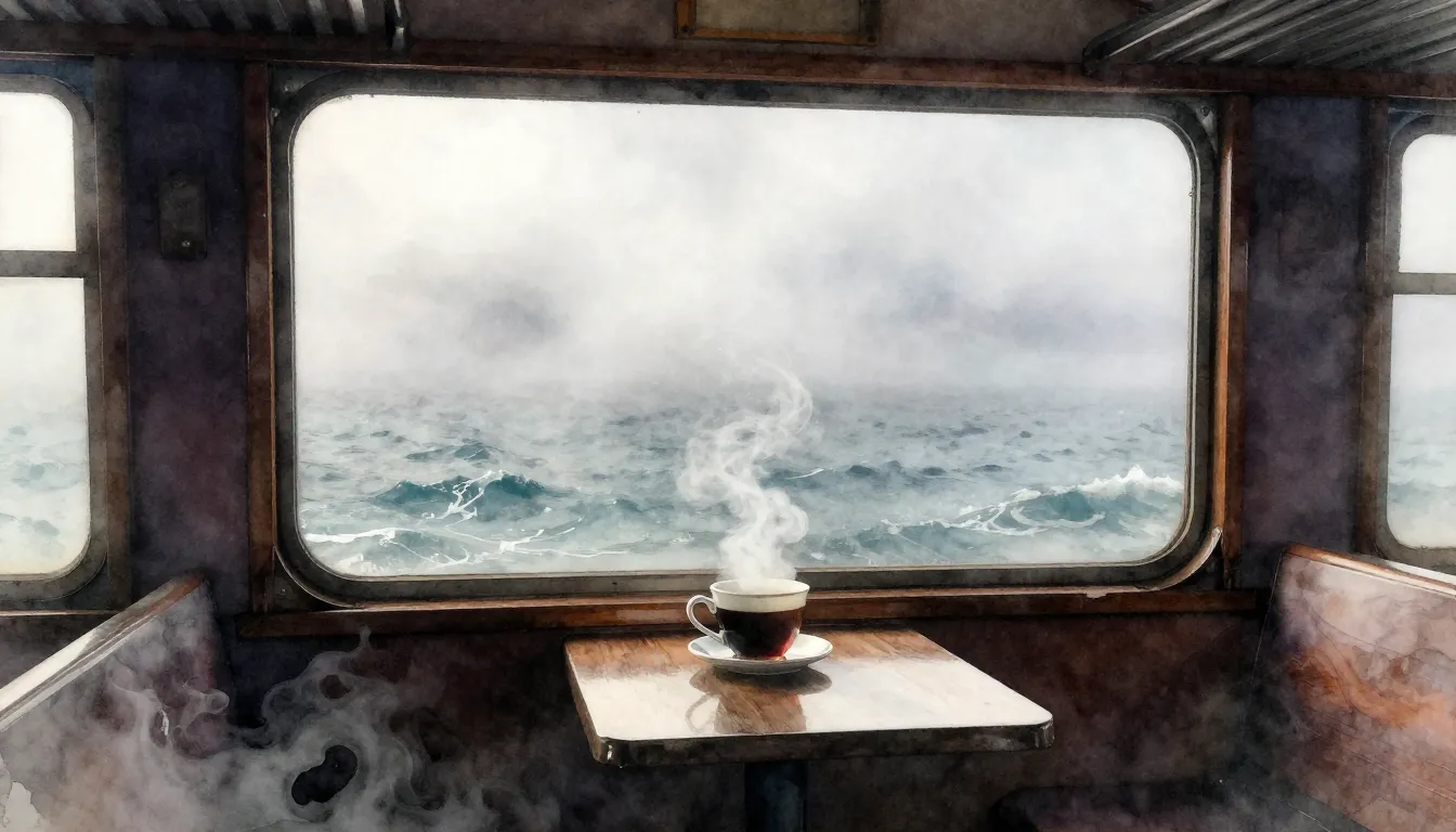 – a river scene obscured by thick mist or fog, creating an ethereal atmosphere