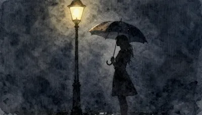 – Watercolor painting of golden rain falling on umbrellas with people running.