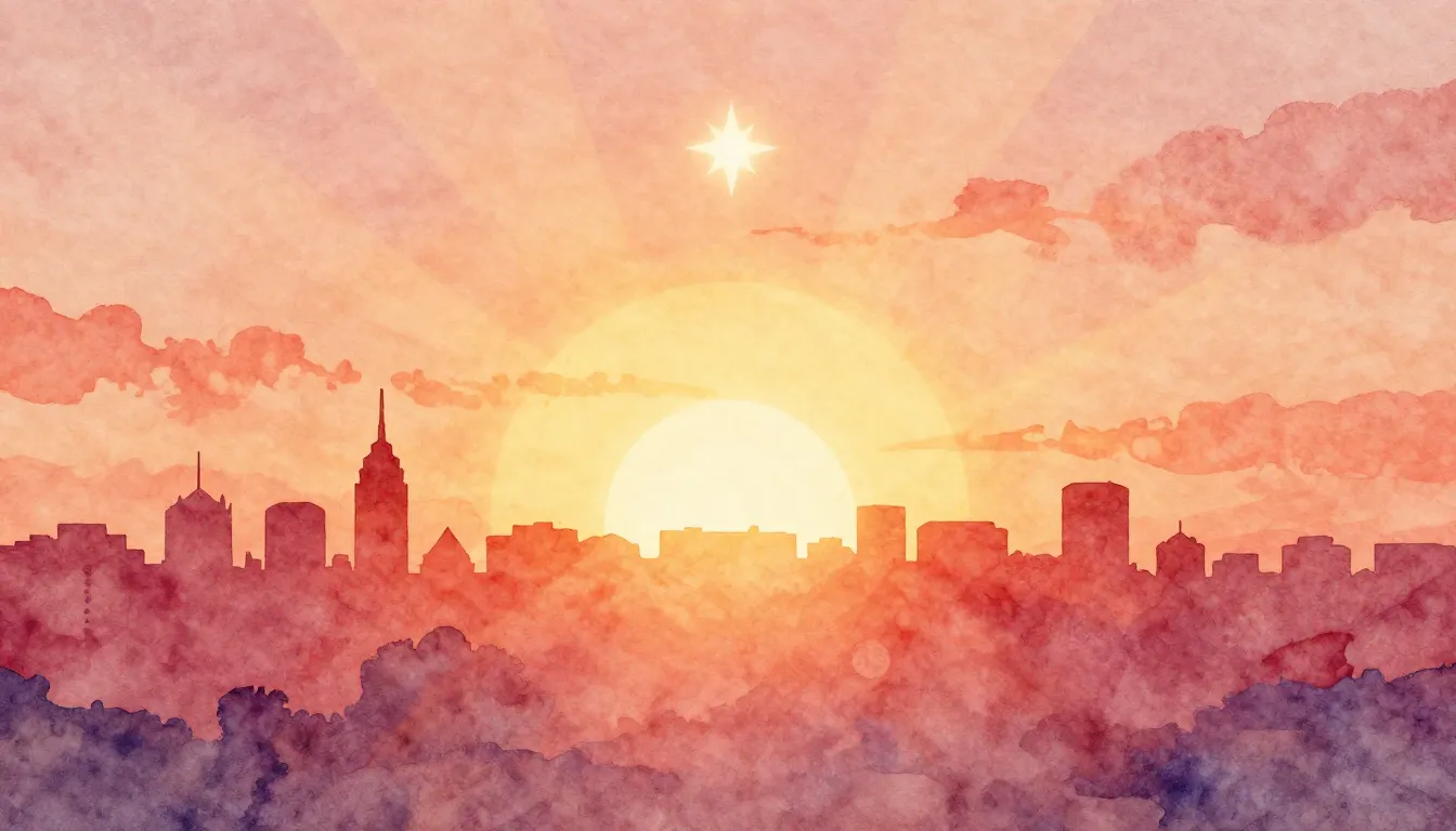 – A vibrant sunset with neon colors, often over a city landscape