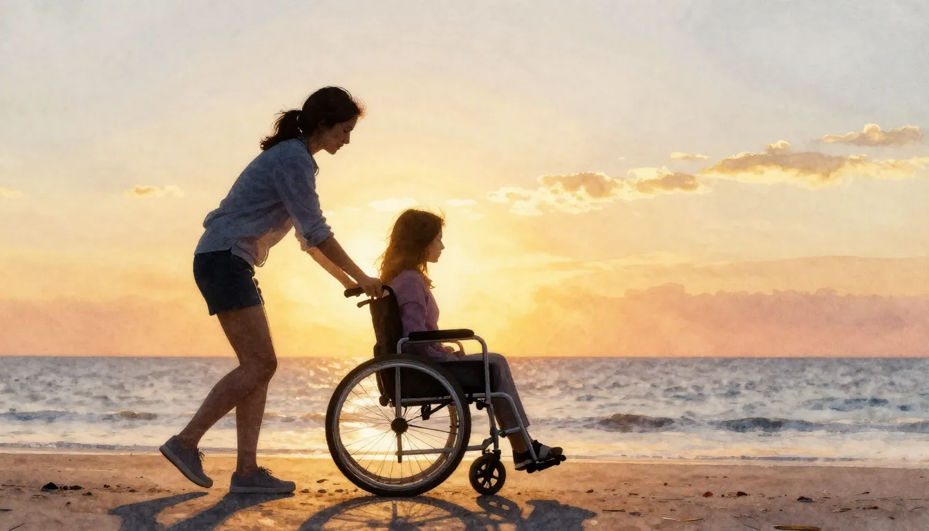 – serene beach scene at sunset with warm colors and calm ocean