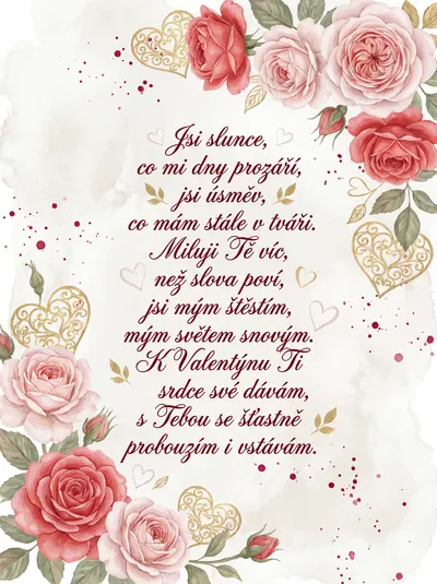 Jsi moje slunce, jsi můj svět, v mém srdci rozkvétáš jako květ. Děkuji za každý společný den, jsi můj nejkrásnější splněný sen. Miluji tě víc, než slova dokážou říct, s tebou chci sdílet všechno a víc.