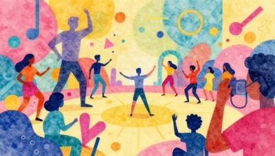 – Ilustración vibrante de un taller creativo con elementos artísticos y colores brillantes.