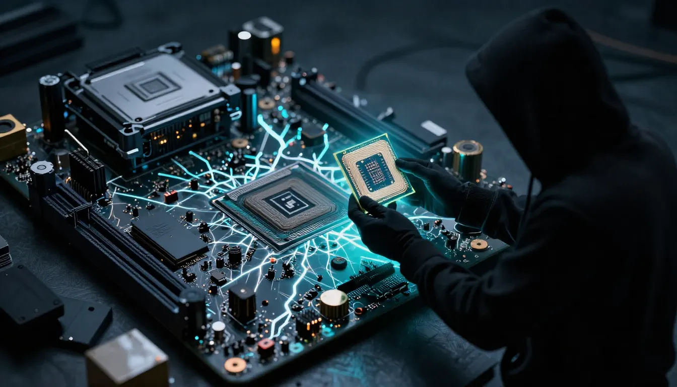 – Un escenario distópico futurista con tecnología avanzada y luces de neón.