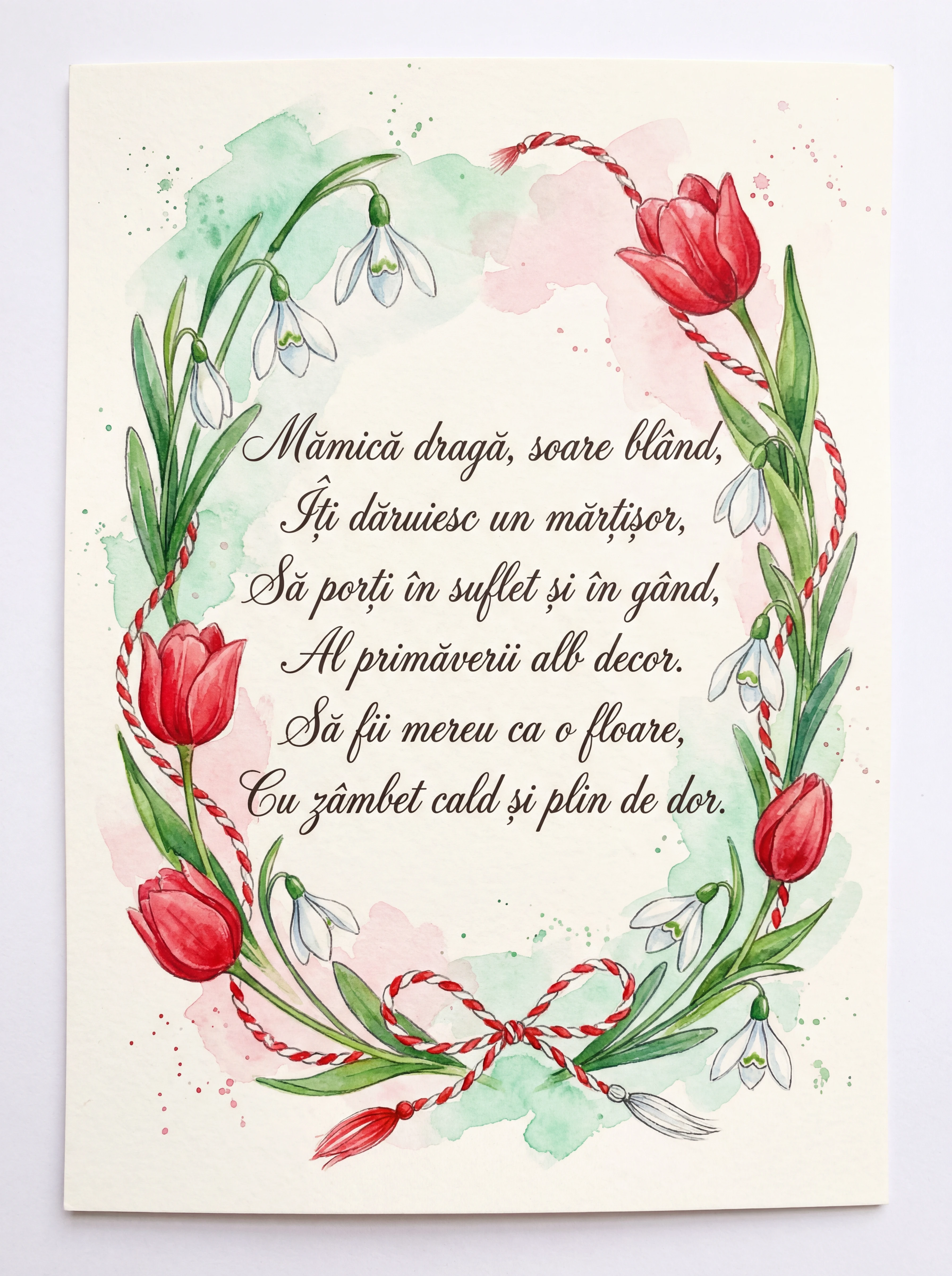 Mămică dragă, soare blând, Îți dăruiesc un mărțișor, Să porți în suflet și în gând, Al primăverii alb decor. Să fii mereu ca o floare, Cu zâmbet cald și plin de dor.