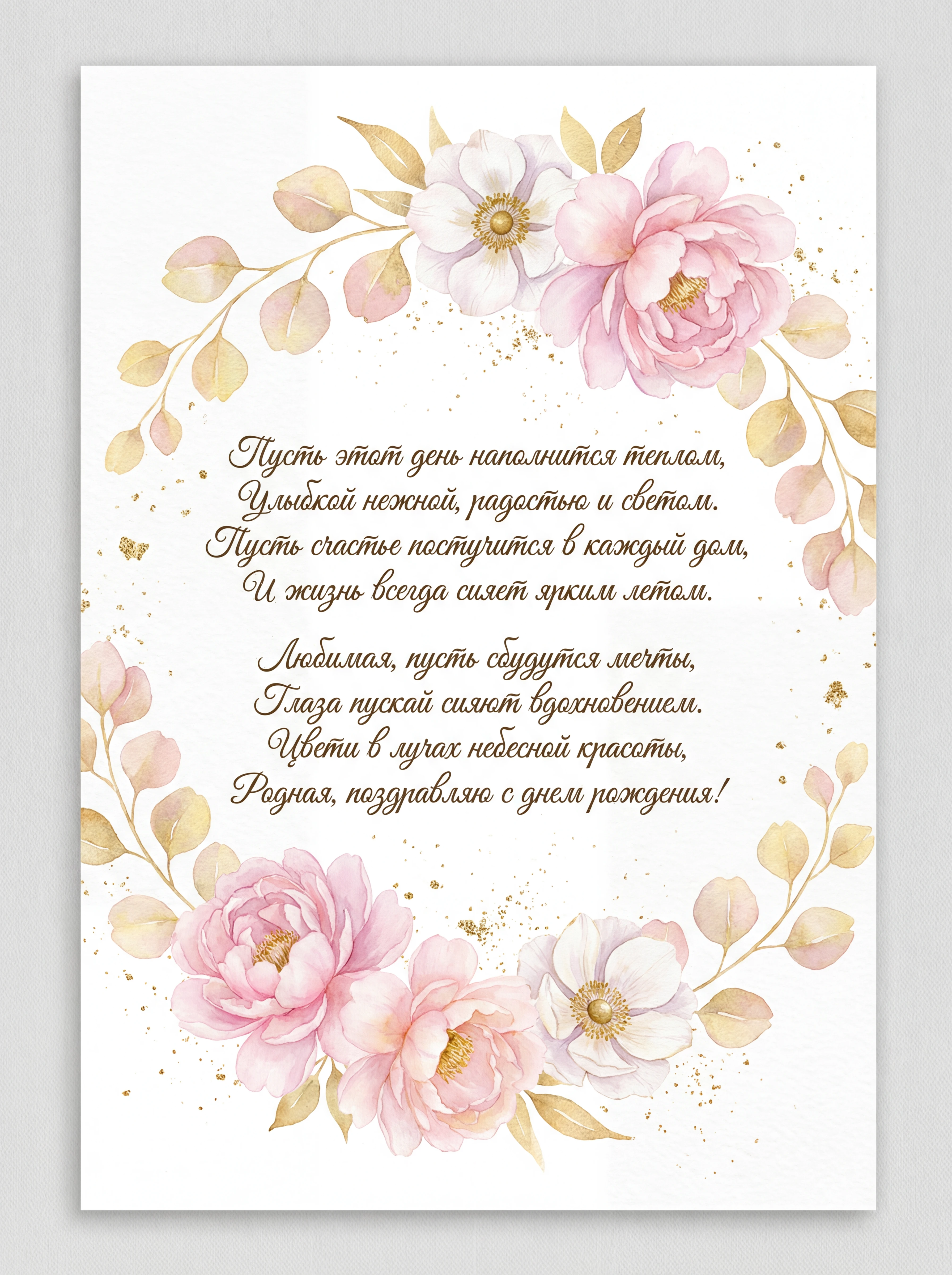 Пусть этот день наполнится теплом, Улыбкой нежной, радостью и светом. Пусть счастье постучится в каждый дом, И жизнь всегда сияет ярким летом. Любимая, пусть сбудутся мечты, Глаза пускай сияют вдохновением. Цвети в лучах небесной красоты, Родная, поздравляю с днем рождения!