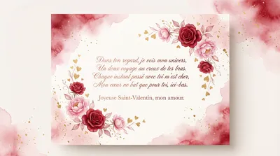 Dans tes yeux, je vois mon bonheur, Chaque instant avec toi est une fleur. Mon cœur bat au rythme du tien, Main dans la main vers notre destin. Joyeuse Saint-Valentin, mon amour, Je t'aimerai pour toujours.