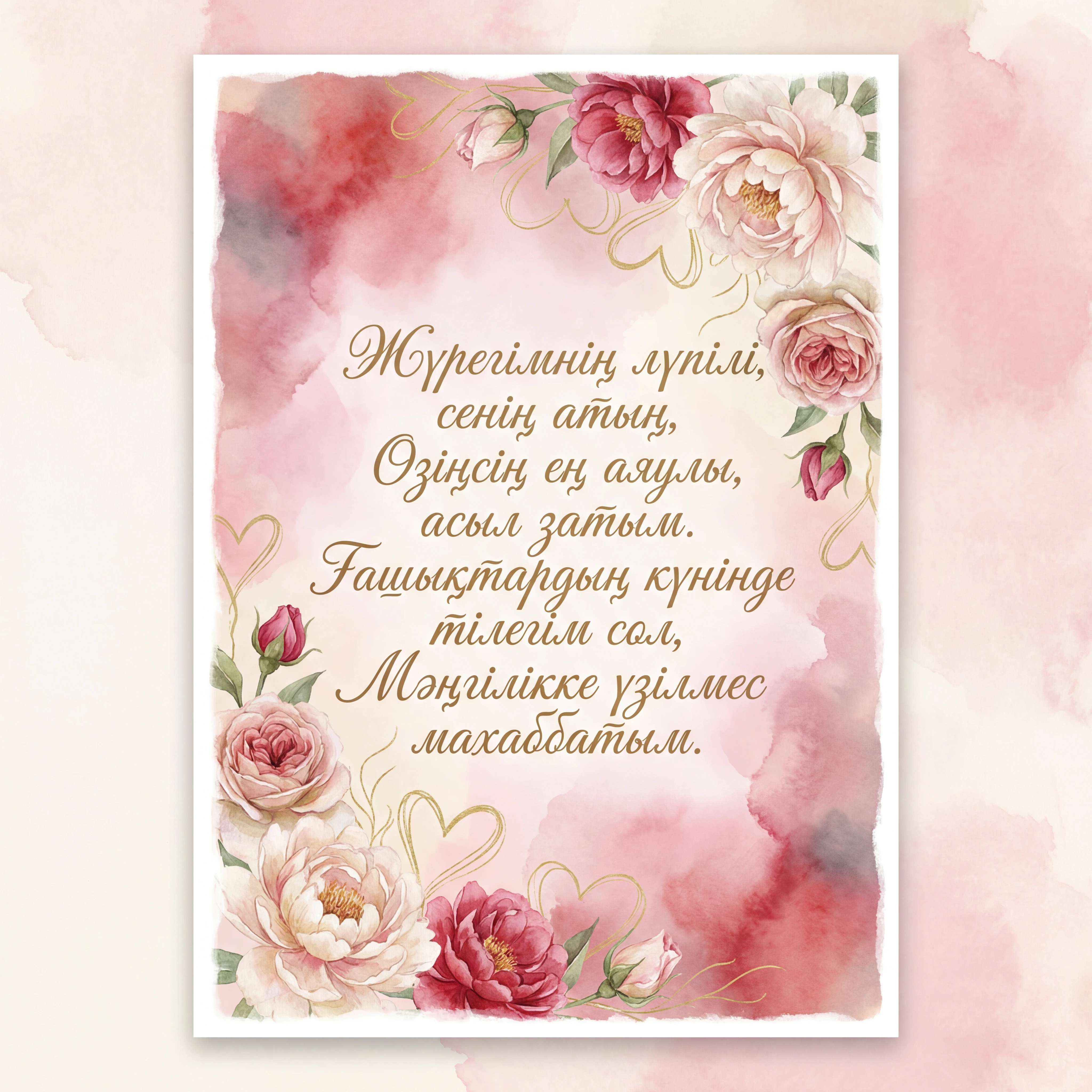 Жүрегімнің лүпілі, сенің атың, Өзіңсің ең аяулы, асыл затым. Ғашықтардың күнінде тілегім сол, Мәңгілікке үзілмес махаббатым.