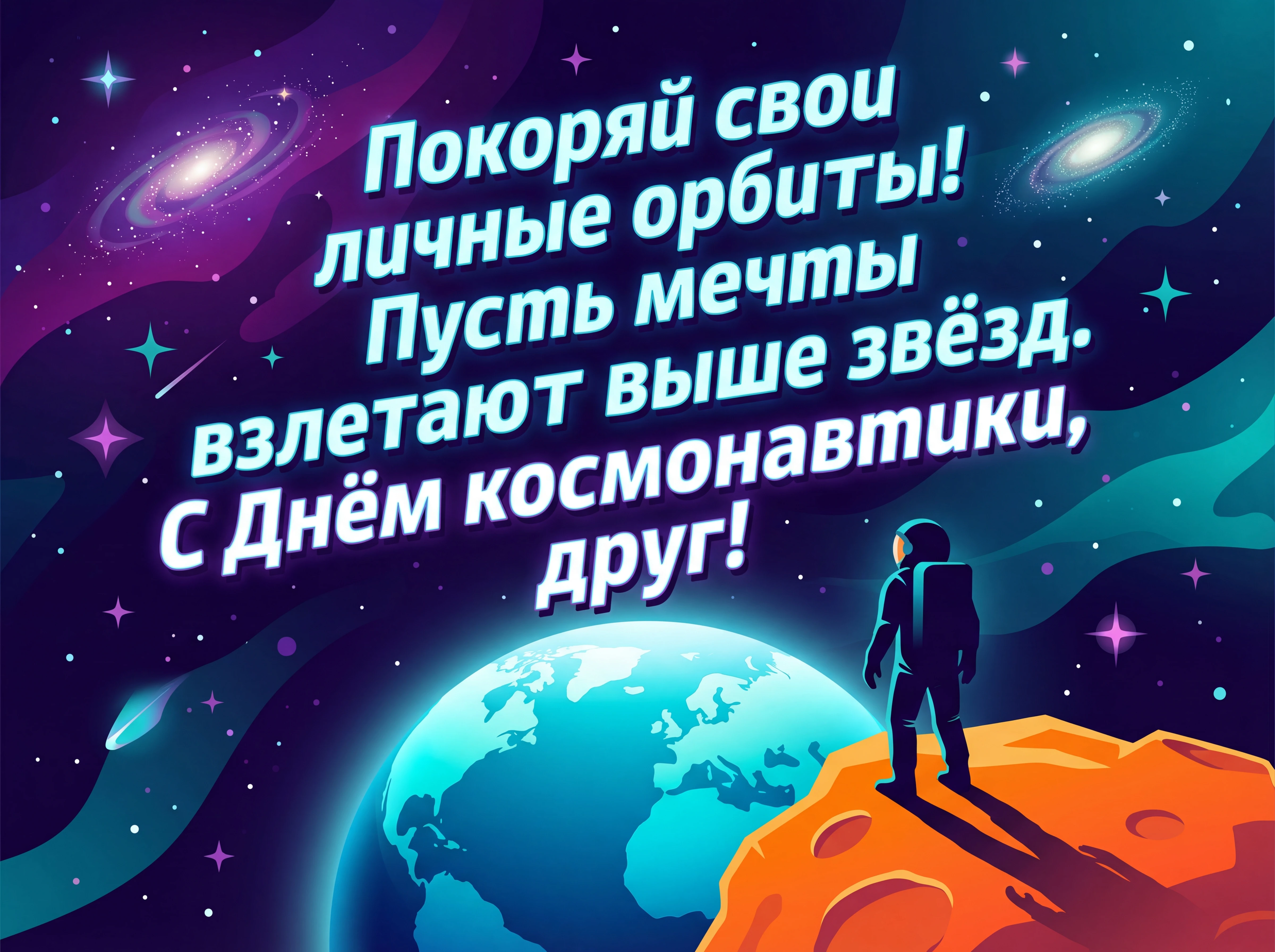 Покоряй свои личные орбиты! Пусть мечты взлетают выше звёзд. С Днём космонавтики, друг!