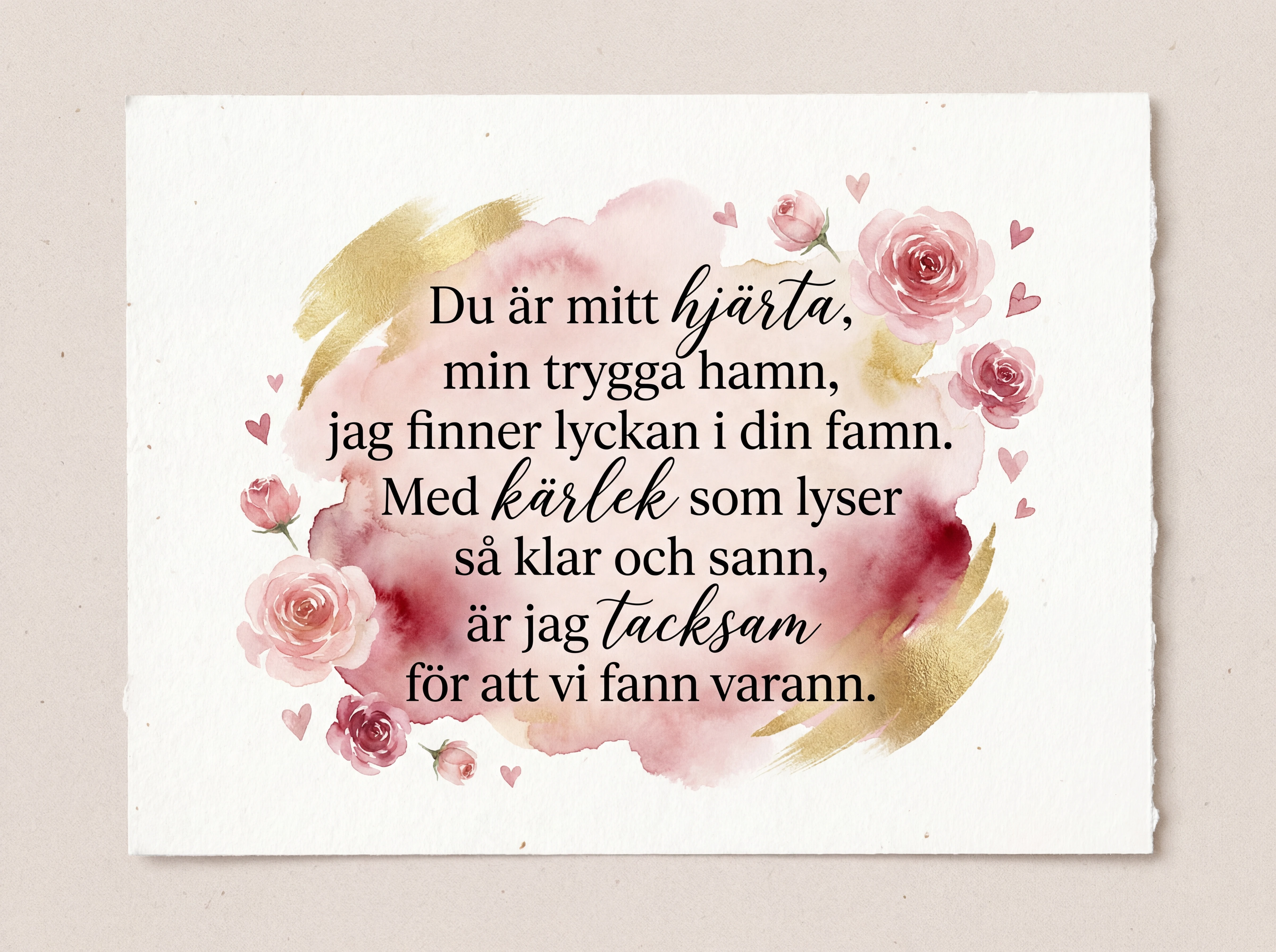 Du är mitt hjärta, min trygga hamn, jag finner lyckan i din famn. Med kärlek som lyser så klar och sann, är jag tacksam för att vi fann varann.