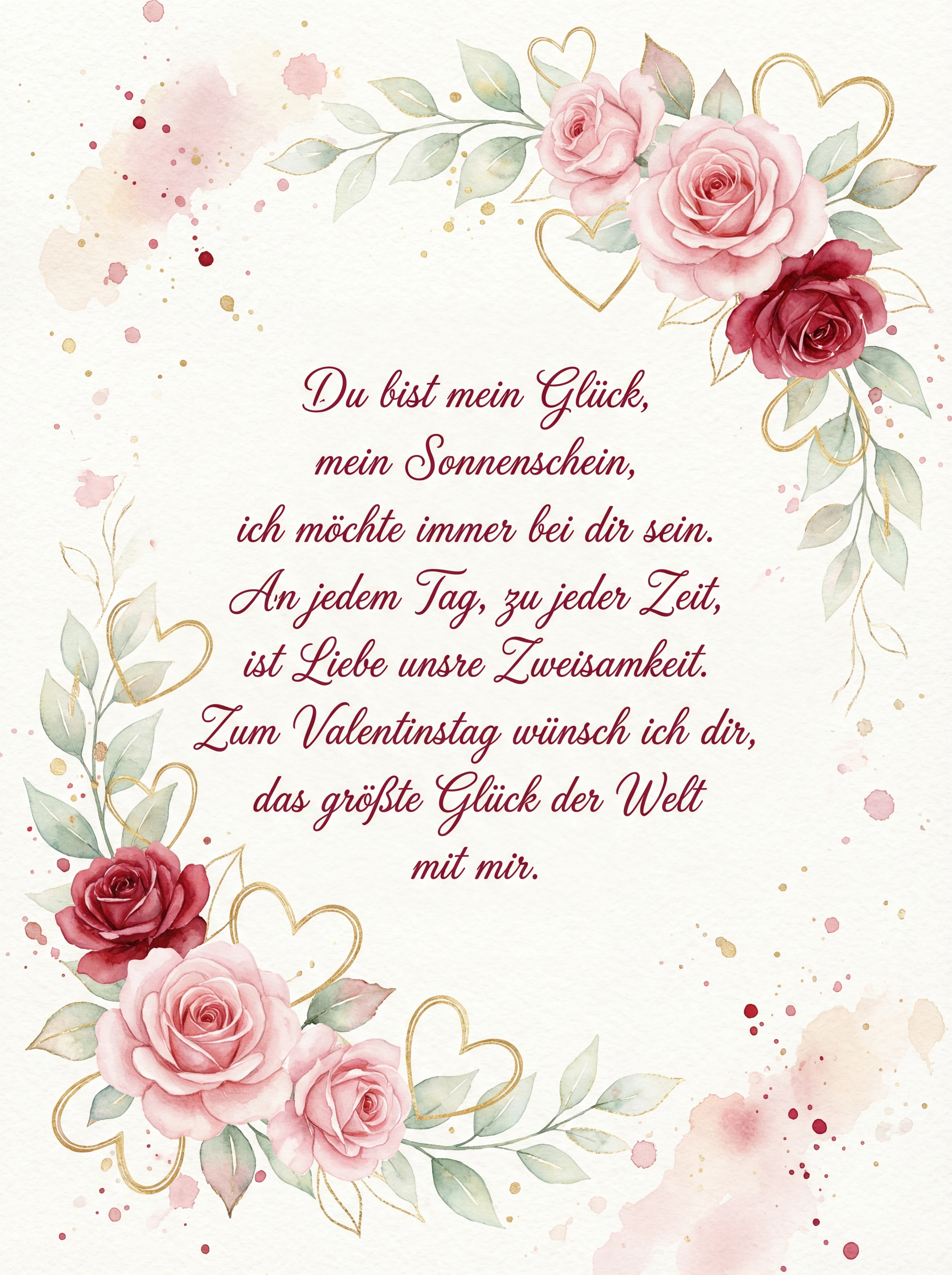 Du bist mein Glück, mein Sonnenschein, ich möchte immer bei dir sein. An jedem Tag, zu jeder Zeit, ist Liebe unsre Zweisamkeit. Zum Valentinstag wünsch ich dir, das größte Glück der Welt mit mir.