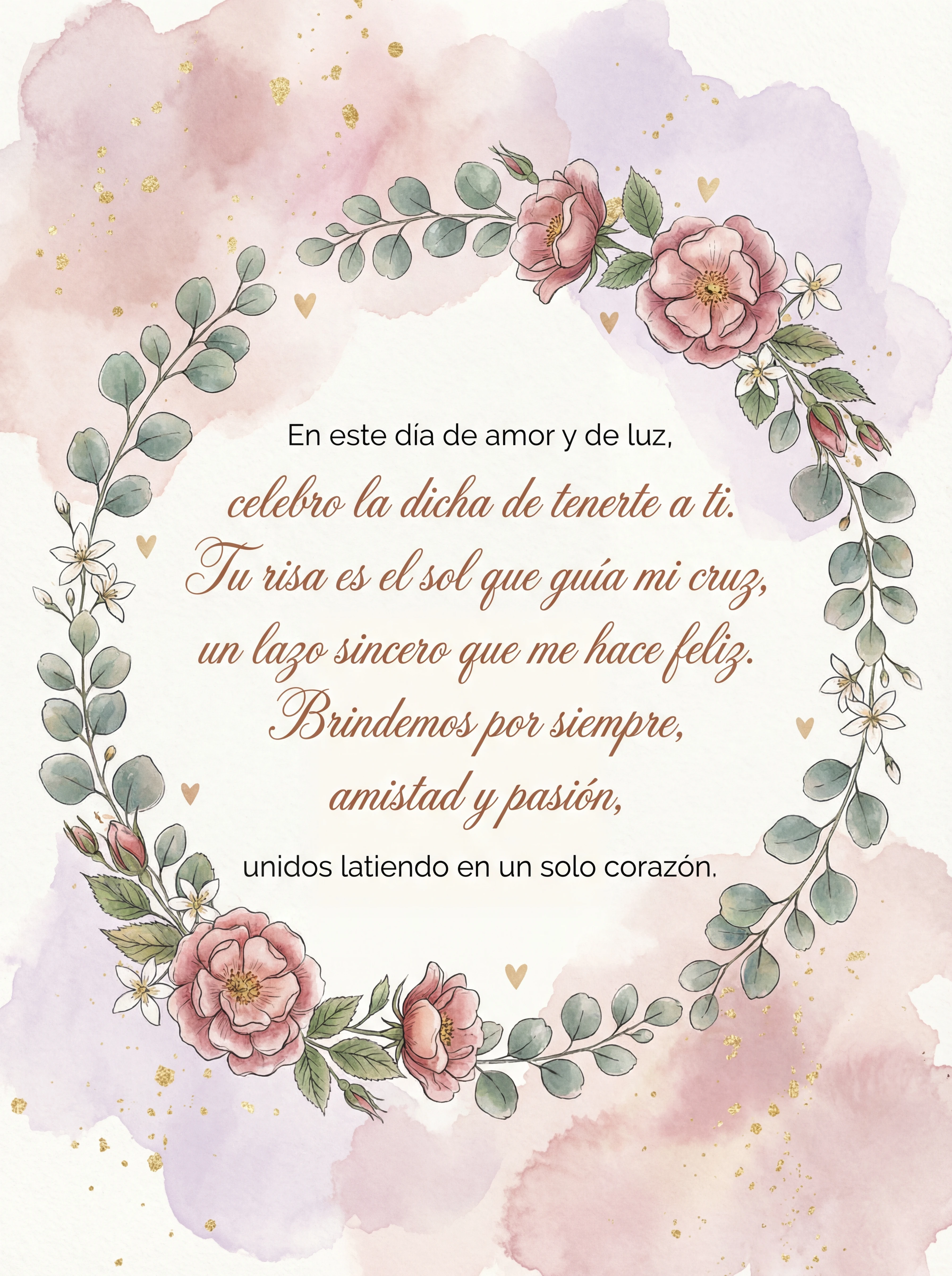 En este día de amor y de luz, celebro la dicha de tenerte a ti. Tu risa es el sol que guía mi cruz, un lazo sincero que me hace feliz. Brindemos por siempre, amistad y pasión, unidos latiendo en un solo corazón.