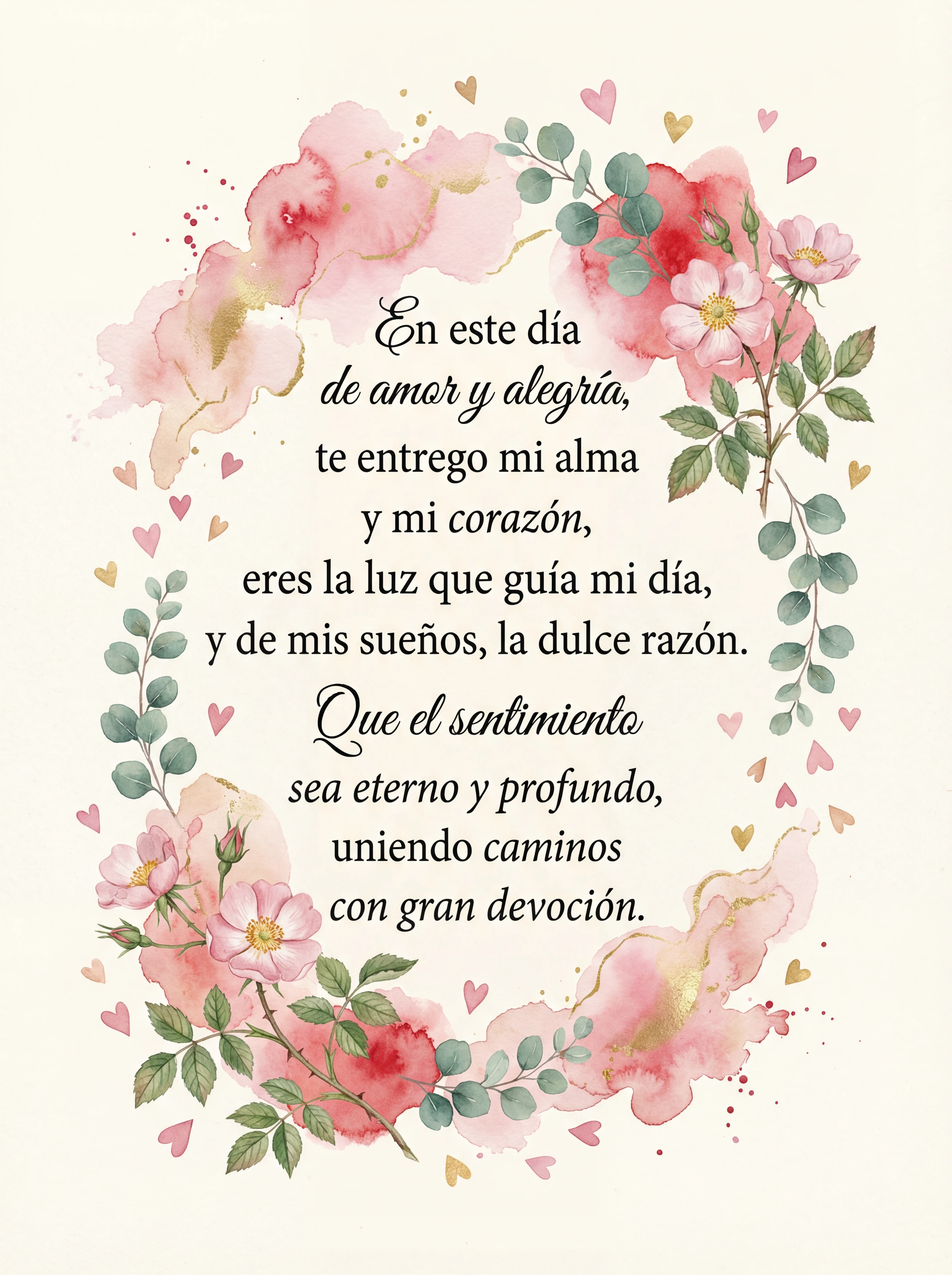 En este día de amor y alegría, te entrego mi alma y mi corazón, eres la luz que guía mi día, y de mis sueños, la dulce razón. Que el sentimiento sea eterno y profundo, uniendo caminos con gran devoción.