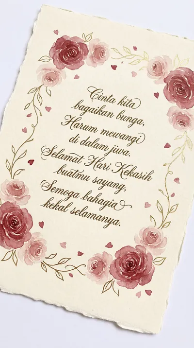 Cinta kita mekar mewangi, Sinar bahagia di dalam hati, Engkaulah peneman yang sejati, Janji setia hingga ke mati. Selamat Hari Kekasih, sayangku.